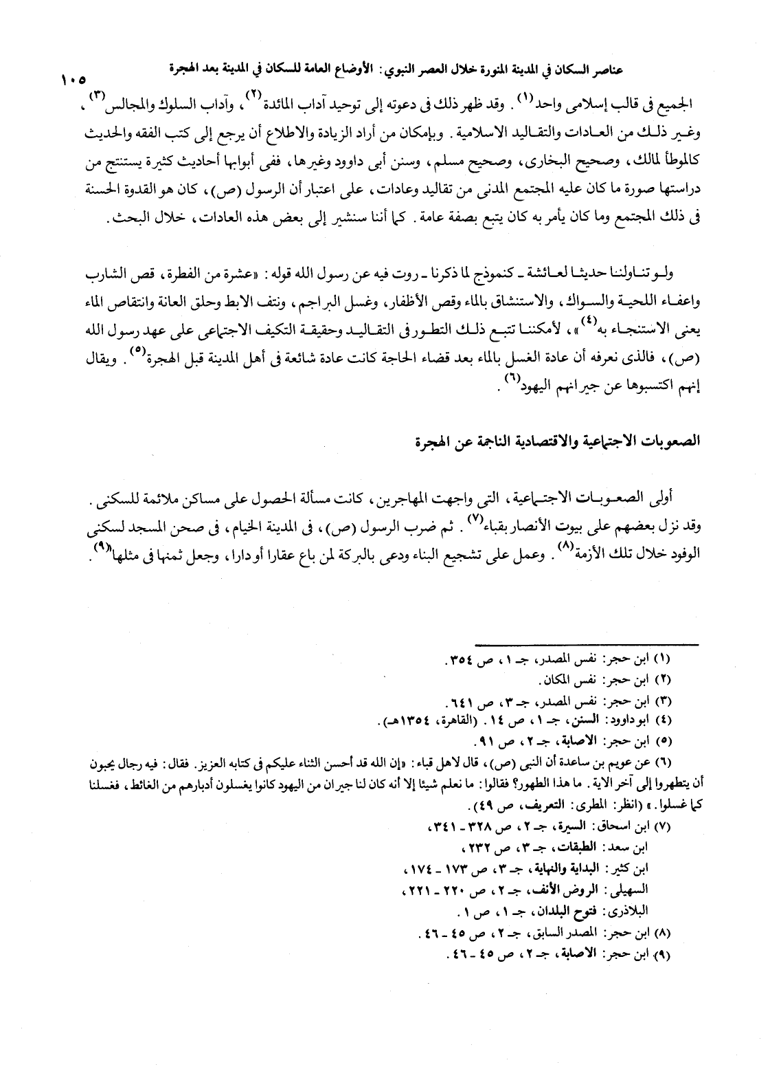 (1) ابن حجر: نفس المصدر، جـ1، ص354. (2) ابن حجر: نفس المكان. (3) ابن حجر: نفس المصدر، جـ3، ص641. (4) أبو داوود: السنن، جـ1، ص14. (القاهرة، 1354هـ). (5) ابن حجر: الإصابة، جـ2، ص91. (6) عن عويم بن ساعدة أن النبي صلى الله عليه وسلم، قال لأهل قباء: "إن الله قد أحسن الثناء عليكم في كتابه العزيز. فقال: فيه رجال يحبون أن يتطهروا إلى آخر الآية. ما هذا الطهور؟ فقالوا: ما نعلم شيئاً إلا أنه كان لنا جيران من اليهود كانوا يغسلون أدبارهم من الغائط، فغسلنا كما غسلوا". (انظر: المطري: التعريف، ص49). (7) ابن إسحاق: السيرة، جـ2، ص328 - 341، ابن سعد: الطبقات، جـ3، ص232، ابن كثير: البداية والنهاية، جـ3، ص173 - 174، السهيلي: الروض الأنف، جـ2، ص220 - 221، البلاذري: فتوح البلدان، جـ1، ص1. (8) ابن حجر: المصدر السابق، جـ2، ص45 - 46. (9) ابن حجر: الإصابة، جـ2، ص45 - 46.