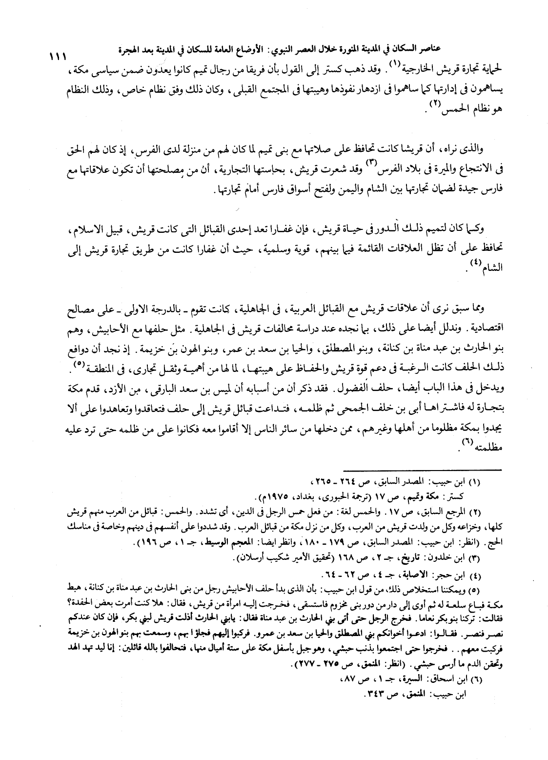 111…لحماية تجارة قريش الخارجية (1). وقد ذهب كستر إلى القول بأن فريقاً من رجال تميم كانوا يعدون ضمن سياسي مكة، يساهمون في إدارتها كما ساهموا في ازدهار نفوذها وهيبتها في المجتمع القبلي، وكان ذلك وفق نظام خاص، وذلك النظام هو نظام الحمس (2). والذي نراه، أن قريشاً كانت تحافظ على صلاتها مع بني تميم لما كان لهم من منزلة لدى الفرس، إذ كان لهم الحق في الانتجاع والميرة في بلاد الفرس (3) وقد شعرت قريش، بحاستها التجارية، أن من مصلحتها أن تكون علاقاتها مع فارس جيدة لضمان تجارتها بين الشام واليمن ولفتح أسواق فارس أمام تجارتها. وكما كان لتميم ذلك الدور في حياة قري، فإن غفاراً تعد إحدى القبائل التي كانت قريش، قبيل الإسلام، تحافظ على أن تظل العلاقات القائمة فيما بينهم، قوية وسلمية، حيث أن غفاراً كانت من طريق تجارة قريش إلى الشام (4). ومما سبق نرى أن علاقات قريش مع القبائل العربية، في الجاهلية، كانت تقوم - بالدرجة الأولى - على مصالح اقتصادية. وندلل أيضاً على ذلك، بما نجده عند دراسة محالفات قريش في الجاهلية. مثل حلفها مع الأحابيش، وهم بنو الارث بن عبد مناة بن كنانة، وبنو المصطلق، والحيا بن سعد بن عمر، وبنو الهون بن خزيمة. إذ نجد أن دوافع ذلك الحلف كانت الرغبة في دعم وقة قريش والحفاظ على هيبتها، لما لها من أهمية وثقل تجاري، في المنطقة (5). ويدخل في هذا الباب أيضاً، حلف الفضول. فقد ذكر أ من أسبابه أن لميس بن سعد البارقي، من الأزد، قدم مكة بتجارة له فاشتراها أبي بن خلف الجمحي ثم ظلمه، فتداعت قبائل قريش إلى حلف فتعاقدوا وتعاهدوا على ألا يجدوا بمكة مظلوماً من أهلها وغيرهم، ممن دخلها من سائر الناس إلا أقاموا معه فكانوا على من ظلمه حتى ترد عليه مظلمته (6).…