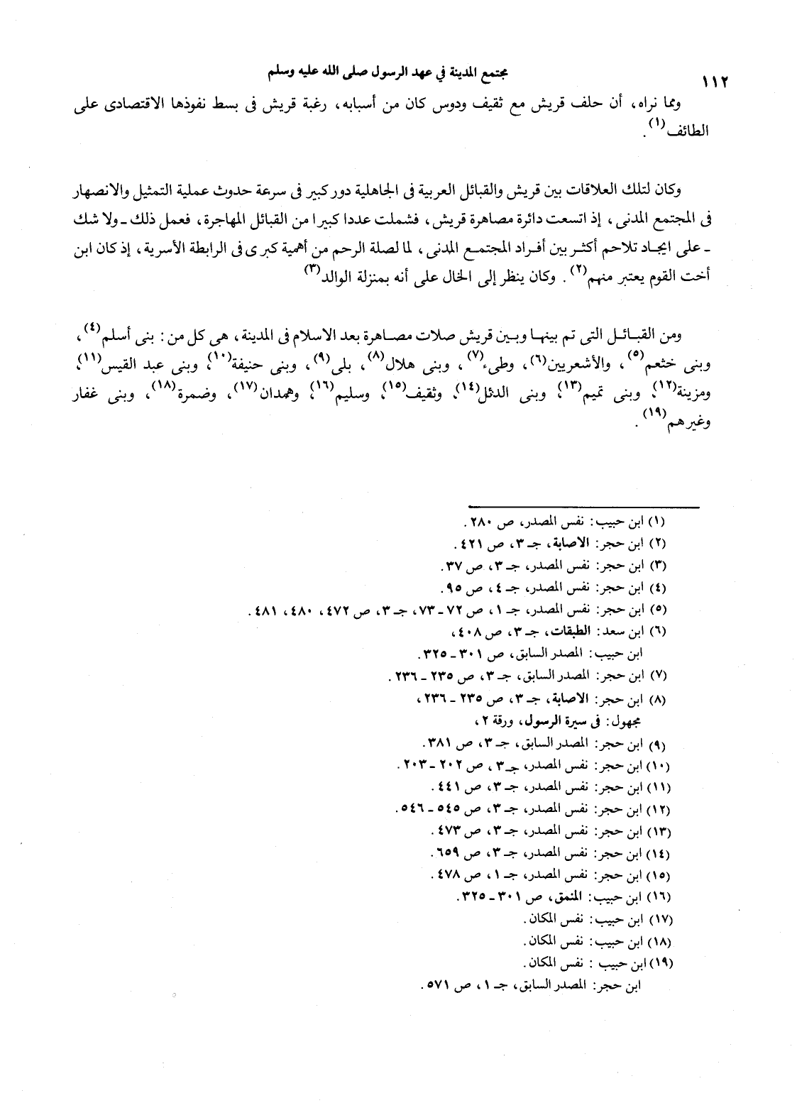 112…ومما نراه، أن حلف قريش مع ثقيف ودوس كان من أسبابه، رغبة قريش في بسط نفوذها الاقتصادي على الطائف (1). وكان لتلك العلاقات بين قريش والقبائل العربية في الجاهلية دور كبير في سرعة حدوث عملية التمثيل والانصهار في المجتمع المدني، إذ اتسعت دائرة مصاهرة قريش، فشملت عدداً كبيراً من القبائل المهاجرة، فعمل ذلك - ولا شك - على إيجاد تلاحم أكثر بين أفراد المجتمع المدني، لما لصلة ارحم من أهمية كبرى في الرابطة الأسرية، إذ كان ابن أخت القوم يعتبر منهم (2). وكان ينظر إلى الخال على أنه بمنزلة الوالد (3). ومن القبائل التي تم بينها وبين قريش صلات مصاهرة بعد الإسلام في المدينة، هي كل من: بني أسلم (4)، وبني خثعم (5)، والأشعريين (6)، وطيء (7)، وبني هلال (8)، بلى (9)، وبني حنيفة (10)، وبني عبد القيس (11)، ومزينة (12)، وبني تميم (13)، وبني الدئل (14)، وثقيف (15)، وسليم (16)، وهمدان (17)، وضمرة (18)، وبني غفار وغيرهم (19).…