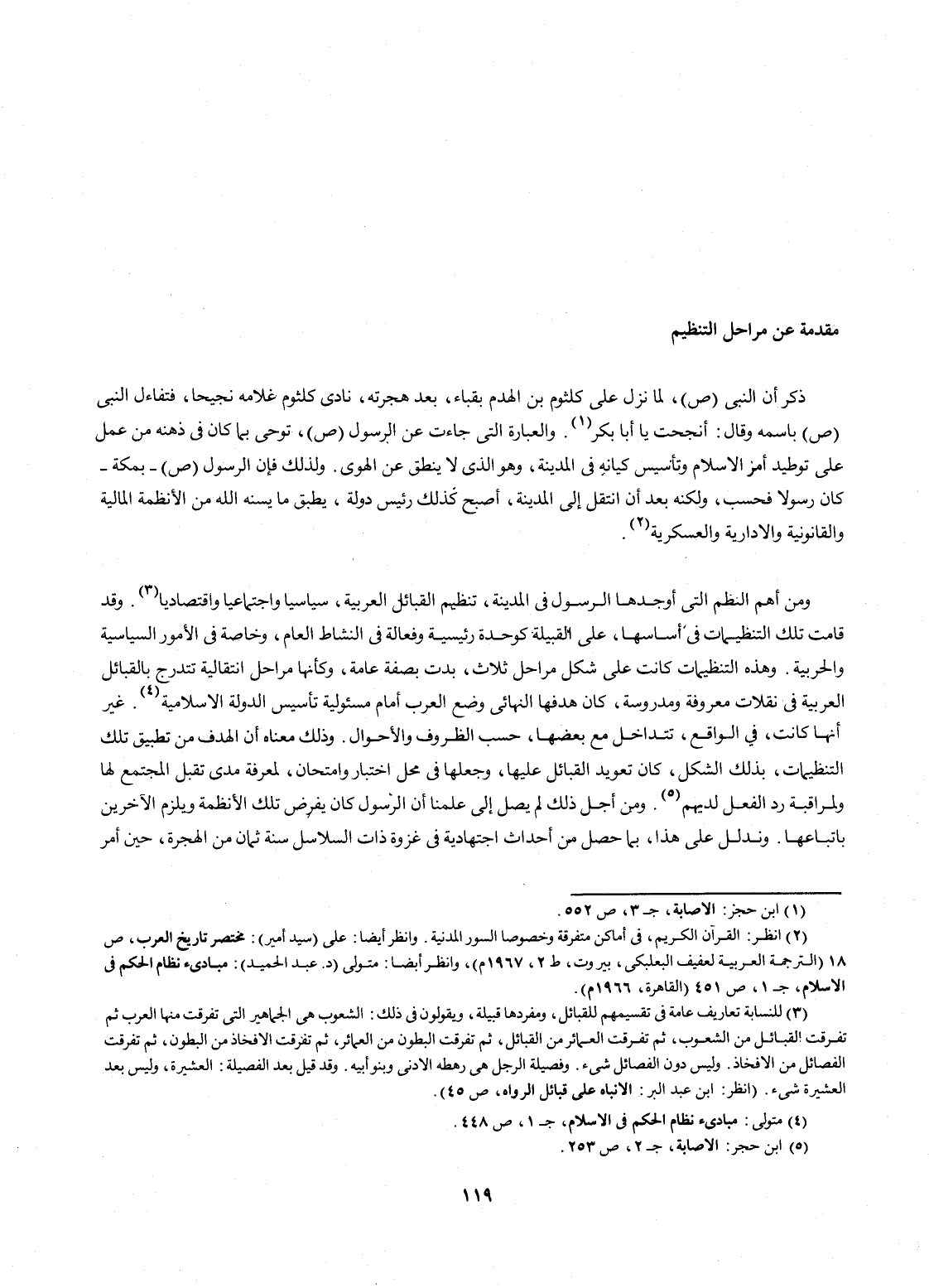 (1) ابن حجر: الإصابة، جـ3، ص552. (2) انظر: القرآن الكريم، في أماكن متفرقة وخصوصاً السور المدنية. وانظر أيضاً: على (سيد أمير): مختصر تاريخ العرب، ص18 (الترجمة العربية لعفيف البعلبكي، بيروت، ط2، ص1967م)، وانظر أيضاً: متولي (د. عبدالحميد): مبادئ نظام الحكم في الإسلام، جـ1، ص451 (القاهرة، 1966م). (3) للنسابة تعاريف عامة في تقسيمهم للقبائل، ومفردها قبيلة، ويقولون في ذلك: الشعوب هي الجماهير التي تفرقت منها العرب ثم تفرقت القبائل من الشعوب، ثم تفرقت العمائر من القبائل، ثم تفرقت البطون من العمائر، ثم تفرقت الأفخاذ من البطون، ثم تفرقت الفصائل من الأفخاذ. وليس دون الفصائل شيء. وفصيلة الرجل هي رهطه الأدنى وبنو أبيه. وقد قيل بعد الفصيلة: العشيرة، وليس بعد العشيرة شيء. (انظر: ابن عبد البر: الأنباه على قبائل الرواة، ص45). (4) متولي: مبادئ نظام الحكم في الإسلام، جـ1، ص448. (5) ابن حجر: الإصابة، جـ2، ص253.