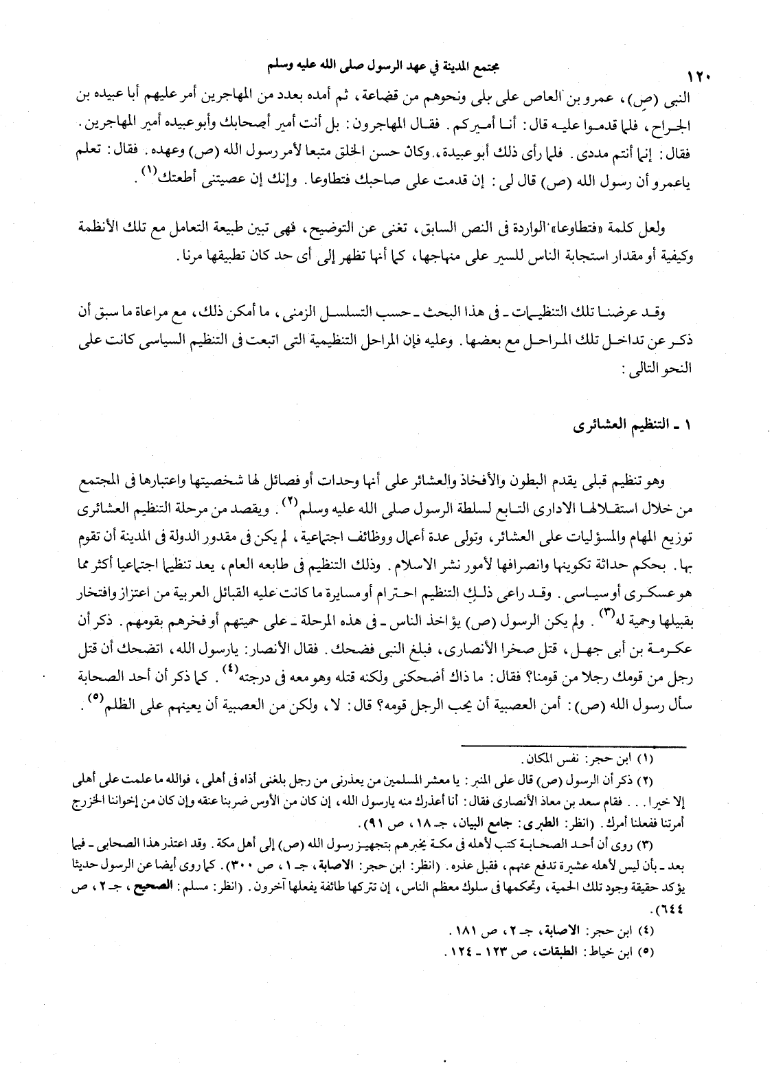 وهو تنظيم قبلي يقدم البطون والأفخاذ والعشائر على أنها وحدات أو فصائل لها شخصيتها واعتبارها في المجتمع من خلال استقلالها الإداري التابع لسلطة الرسول صلى الله عليه وسلم (2). ويقصد من مرحلة التنظيم العشائري توزيع المهام والمسؤويات على العشائر، وتولي عدة أعمال ووظائف اجتماعية، لم يكن في مقدور الدولة في المدينة أن تقوم بها. بحكم حداثة تكوينها وانصرافها لأمور نشر الإسلام. وذلك التنظيم في طابعه العام، يعد تنظيماً اجتماعياً أكثر مما هو عسكري أو سياسي. وقد راعى ذلك التنظيم احترام أو مسايرة ما كانت عليه القبائل العربية من اعتزاز وافتخار بقبيلها وحمية له (3). ولم يكن الرسول صلى الله عليه وسلم يؤاخذ الناس - في هذه المرحلة - على حميتهم أو فخرهم بقومهم. ذكر أن عكرمة بن أبي جهل، قتل صخرا الأنصاري، فبلغ النبي فضحك. فقال الأنصار: يا رسول الله، اتضحك أن قتل رجل من قومك رجلاً من قومنا؟ فقال: ما ذاك أضحكني ولكنه قتله وهو معه في درجته (4). كما ذكر أن أحد الصحابة سأل رسول الله صلى الله عليه وسلم : أمن العصبية أن يحب الرجل قومه؟ قال: لا، ولكن من العصبية أن يعينهم على الظلم (5).…