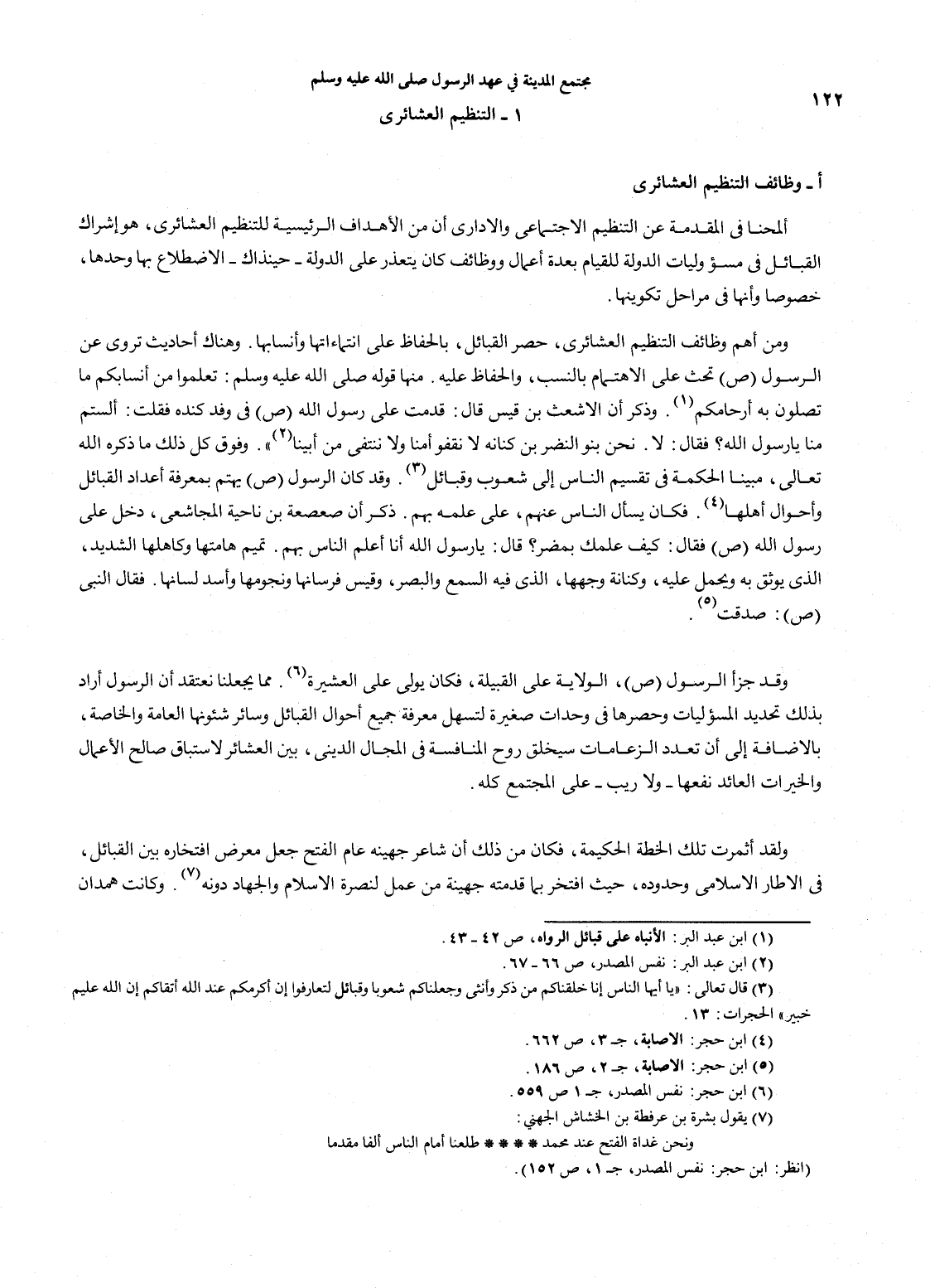 ألمحنا في المقدمة عن التنظيم الاجتماعي والإداري أن من الأهداف الرئيسية للتنظيم العشائري، هو إشراك القبائل في مسؤوليات الدولة للقيام بعدة أعمال ووظائف كان يتعذر على الدلة - حينذاك - الاضطلاع بها وحدها، خصوصاً وأنها في مراحل تكوينها. ومن أهم وظائف التنظيم العشائري، حصر القبائل بالحفاظ على انتنماءاتها وأنسابها. وهناك أحاديث تروي عن الرسول صلى الله عليه وسلم تحث على الاهتمم بالنسب، والحفاظ عليه. منها قوله صلى الله عليه وسلم: تعلموا من أنسابكم ما تصلون به أرحامكم (1). وذكر أن الأشعث بن قيس قال: قدمت على رسول الله صلى الله عليه وسلم في وفد كنده فقلت: ألستم منا يا رسول الله؟ فقال: لا. نحن بنو النضر بن كنانة لا نقفوا أمناً ولا ننتفي من أبينا (2) ". وفوق كل ذلك ما ذكره الله تعالى، مبيناً الحكمة في تقسيم الناس إلى شعوب وقبائل (3). وقد كان الرسول صلى الله عليه وسلم يهتم بمعرفة أعداد القبائل وأحوال أهلها (4). فكان يسأل الناس عنهم، على علمه بهم. ذكر أن صعصعة بن ناحية المجاشعي، دخل على رسول الله صلى الله عليه وسلم فقال: كيف علمك بمضر؟ قال: يا رسول الله أنا أعلم الناس بهم. تميم هامتها وكاهلها الشديد، الذي يوثق به يوحمل عليه، وكنانة وجهها، الذي فيه السمع والبصر، وقيس فرسانها ونجومها وأسد لسانها. فقال النبي (ص): صدقت (5). وقد جزأ الرسول صلى الله عليه وسلم، الولاية على القبيلة، فكان يولي على العشيرة (6). مما يجعلنا نعتقد أن الرسول أراد بذلك تحديد المسئوليات وحصرها في وحدات صغيرة لتسهل معرفة جميع أحوال القبائل وسائر شئونها العامة والخاصة، بالإضافة إلى أن تعدد الزعامات سيخلق روح المنافسة في المجال الدينين، بين العشائر لاستباق صالح الأعمال والخيرات العائد نفعها - ولا ريب - على المجتمع كله. ولقد أثمرت تلك الخطة الحكيمة، فكان من ذلك أن شاعر جهينة عام الفتح جعل معرض افتخاره بين القبائل، في الإطار الإسلامي وحدوده، حيث افتخر بما قدمته جهينة من عمل لنصرة الإسلام والجهاد دونه (7). وكانت همدان…