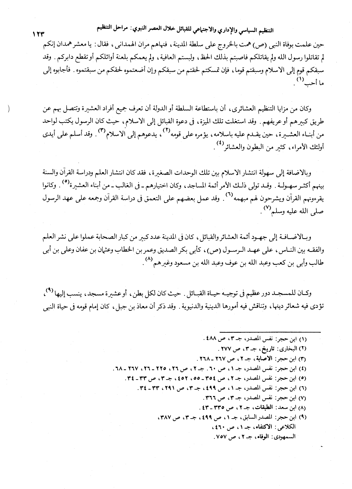123…حين علمت بوفاة النبي صلى الله عليه وسلم همت بالخروج على سلطة المدينة، فنهاهم مران الهمداني، فقال: يا معشر همدان إنكم لم تقاتلوا رسول الله ولم يقاتلكم فاصبتم بذلك الحظ، ولبستم العافية، ولم يعمكم بلعنة أوائلكم أو تقطع دابركم. وقد سبقكم قوم إلى الإسلام وسبقتم قوماً، فإن تمسكتم لحقتم من سبقكم وإن أضعتموه لحقكم من سبقتموه. فأجابوه إلى ما أحب (1). وكان من مزايا التنظيم العشائري، أن باستطاعة السلطة أو الدولة أن تعرف جميع أفراد العشيرة وتتصل بهم عن طريق كبيرهم أو عريفهم. وقد استغلت تلك الميزة، في دعوة القبائل إلىالإسلام، حيث كان الرسول يكتب لواحد من أبناء العشيرة، حين يقدم عليه بإسلامه، يؤمره على قومه (2)، يدعوهم إلى الإسلام (3). وقد أسلم على أيدي أولئك المراء، كثير من البطون والعشائر (4). وبالإضافة إلى سهولة انتشار الإسلام بين تلك الوحدات الصغيرة، فقد كان انتشار العلم ودراسة القرآن والسنة بينهم أكثر سهولة. وقد تولى ذلك الأمر أئمة المساجد، وكان اختيارهم - في الغالب - من أبناء العشيرة (5). وكانوا يقرءونهم القرآن ويشرحون لهم مبهمه (6). وقد عمل بعضهم على التعمق في دراسة القرآن وجمعه على عهد الرسول صلى الله عليه وسلم (7). وبالإضافة إلى جهود أئمة العشائر والقبال، كان في المدينة عدد كبير من كبار الصحابة عملوا على نشر العلم والفقه بين الناس، على عهد الرسول صلى الله عليه وسلم، كأبي بكر الصديق وعمر بن الخطاب وعثمان بن عفان وعلي بن أبي طالب وأبي بن كعب وعبدالله بن عوف وعبدالله بن مسعود وغيرهم (8). وكان للمسجد دور عظيم في توجيه حياة القبائل. حيث كان لكل بطن، أو عشيرة مسجد، ينسب إليها (9)، تؤدي فيه شعائر دينها، وتناقش فيه أمورها الدينية والدينية. وقد ذكر أن معاذ بن جبل، كان إمام قومه في حياة النبي…