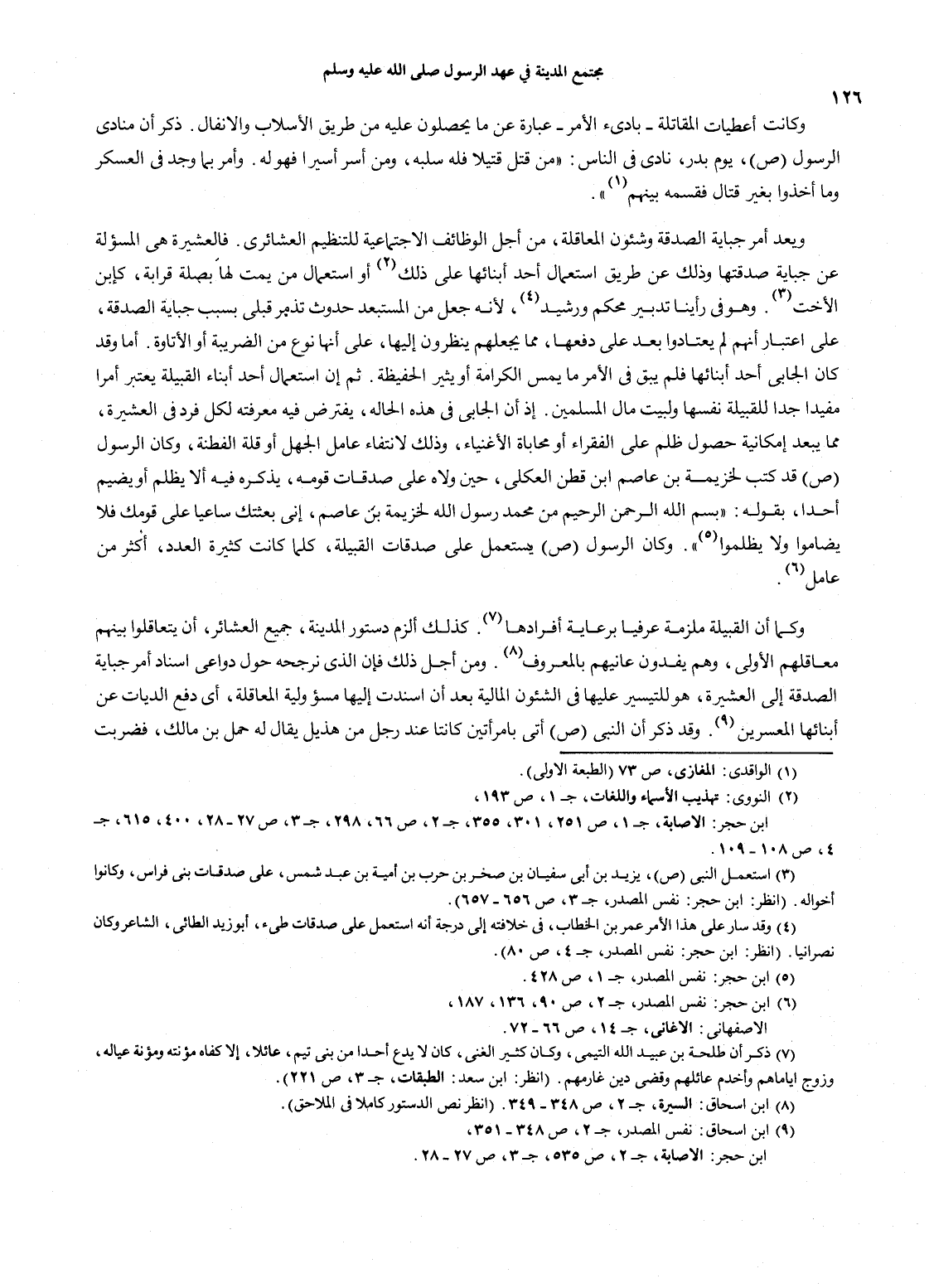 (1) الواقدي: المغازي، ص73 (الطبعة الأولى). (2) النووي: تهذيب الأسماء واللغات، جـ1، ص193. ابن حجر: الإصابة، جـ1، ص251، 301، 355، جـ2، ص66، 298، جـ3، ص27 - 28، 400، 615، جـ4، ص108، 109. (3) استعمل النبي صلى الله عليه وسلم، يزيد بن أبي سفيان بن صخر بن حرب بن أمية بن عبد شمس، على صدقات بني فراس، وكانوا أخواله. (انظر: ابن حجر: نفس المصدر، جـ3، ص656 - 657). (4) وقد سار على هذا الأمر عمر بن الخطاب، في خلافته إلى درجة أنه استعمل على صدقات طيء، أبو زيد الطائي، الشاعر وكان نصرانياً. (انظر: ابن حجر: نفس المصدر، جـ4، ص80). (5) ابن حجر: نفس المصدر، جـ1، ص428. (6) ابن حجر: نفس المصدر، جـ2، ص90، 136، 187، الأصفهاني: الأغاني، جـ14، ص66 - 72. (7) ذكر أن طلحة بن عبيد الله التيمي، وكان كثير الغنى، كان لايدع أحداً من بني تيم، عائلاً، إلا كفاه مؤنته ومؤنة عياله، وزوج أياماهم وأخدم عائلهم وقضى دين غارمهم. (انظر: ابن سعد: الطبقات، جـ3، ص221). (8) ابن إسحاق: السيرة، جـ2، ص348 - 349. (انظر نص الدستور كاملاً في الملاحق). (9) ابن إسحاق: نفس المصدر، جـ2، ص348 - 351، ابن حجر: الأصابة، جـ2، ص535، جـ3، ص27 - 28.