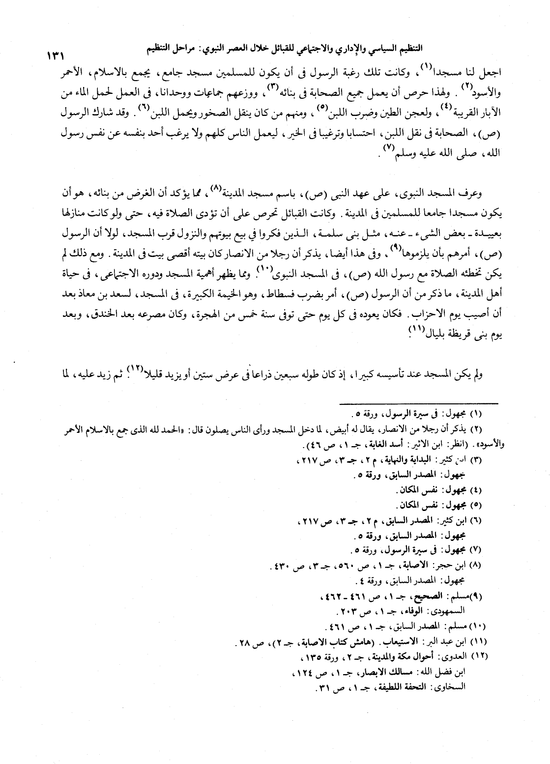 (1) مجهول: في سيرة الرسول، ورقة 5. (2) يذكر أن رجلاً من الأنصار، يقال له أبيض، لما دخل المسجد ورأى الناس يصلون قال: "الحمد لله الذي جمع بالإسلام الأحمر والأسود". (انظر: ابن الأثير: أسد الغابة، جـ1، ص46). (3) ابن كثير: البداية والنهاية، م2، جـ3، ص217، مجهول: المصدر السابق، ورقة 5. (4) مجهول: نفس المكان. (5) مجهول: نفس المكان. (6) ابن كثير: المصدر السابق، م2، جـ3، ص217، مجهول: المصدر السابق، ورقة 5. (7) مجهول: في سيرة الرسول، ورقة 5. (8) ابن حجر: الإصابة، جـ1، ص560، جـ3، ص430. مجهول: المصدر السابق، ورقة 4. (9) مسلم: الصحيح، جـ1، ص461 - 462، السمهودي: الوفاء، جـ1، ص203. (10) مسلم: المصدر السابق، جـ1، ص461. (11) ابن عبد البر: الاستيعاب. (هامش كتاب الإصابة، جـ2)، ص28. (12) العدوى: أحوال مكة والمدينة، جـ2، ورقة 135، ابن فضل الله: مسالك الأبصار، جـ1، ص124، السخاوي: التحفة اللكيفة، جـ1، ص31.