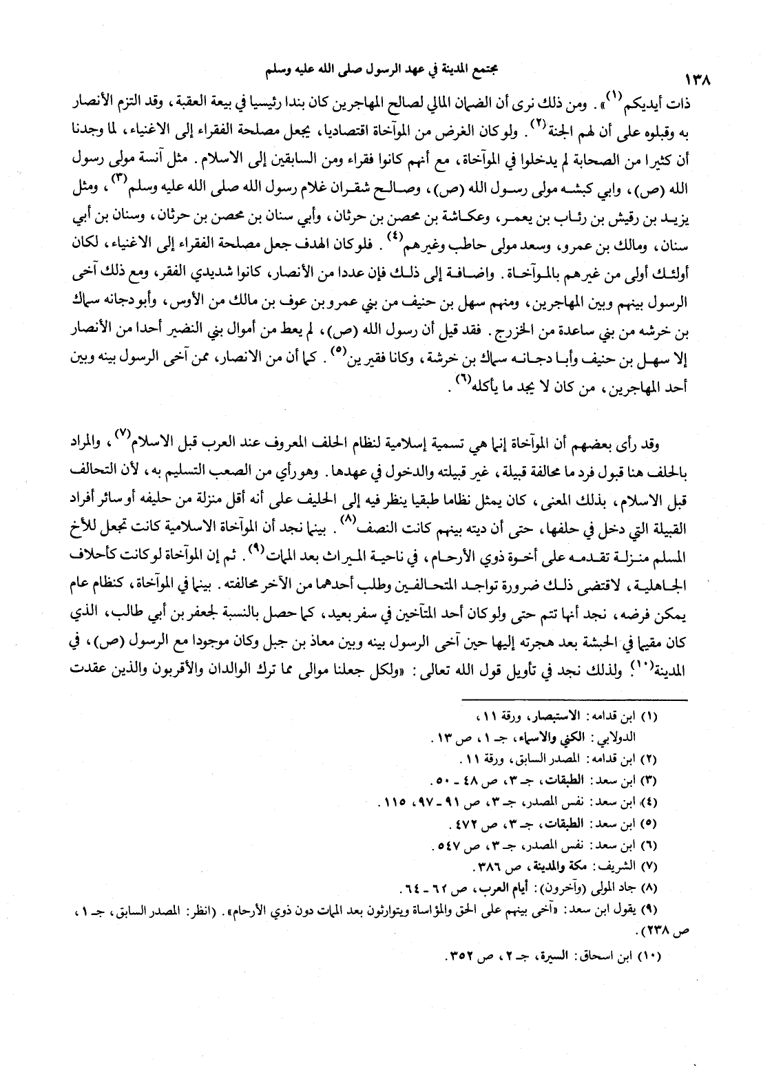 138…ذات أيديكم (1) ". ومن ذلك نرى أن الضمان المالي لصالح المهاجرين كان بنداً رئيسياً في بيعة العقبة، وقد التزم الأنصار به وقبلوه على أن نلهم الجنة (2). ولو كان الغرض من الموآخاة اقتصادياً، يجعل مصلحة الفقراء إلى الأغنياء، لما وجدنا أن كثيراً من الصحابة لم يدخلوا في الموآخاة، مع أنهم كانوا فقراء ومن السابقين إلى الإسلام. مثل آنسة مولى رسول الله صلى الله عليه وسلم، وأبي كبشة مولى رسول الله صلى الله عليه وسلم، وصالح شقران غلام رسول الله صلى الله عليه وسلم (3)، ومثل يزيد بن رقيش بن رئاب بن يعمر، وعكاشة بن محصن بن حرثان، وأبي سنان بن محصن بن حرثان، وسنان بن أبي سنان، ومالك بن عمرو، وسعد مولى حاطب وغيرهم (4). فلو كان الهدف جعل مصلحة الفقراء إلى الأغنياء، لكان أولئك أولى من غيرهم بالموآخاة. وإضافة إلى ذلك فإن عدداً من الأنصار، كانوا شديدي الفقر، ومع ذلك آخى الرسول بينهم وبين المهاجرين، ومنهم سهل بن حنيف من بني عمرو بن عوف بن مالك من الأوس، وأبو دجانه سماك بن خرشة من بني ساعدة من الخزرج. فقد قيل أن رسول الله صلى الله عليه وسلم، لم يعط من أموال بني النضير أحداً من الأنصار إلا سهل بن حنيف وأبا دجانه سماك بن خرشة، وكانا فقيرين (5). كما أن من الأنصار، ممن آخى الرسول بينه وبين أحد المهاجرين، من كان لا يجد ما يأكله (6). وقد رأى بعضهم أن الموآخاة إنما هي تسمية إسلامية لنظام الحلف المعروف عند العرب قبل الإسلام (7)، والمراد بالحلف هنا قبول فرد ما محالفة قبيلة، غير قبيلته والدخول في عهدها. وهو رأي من الصعب التسمي به، لأن التحالف قبل الإسلام، بذلك المعنى، كان يمثل نظاماً طبقياً ينظر فيه إلى الحليف على أنه أقل منزلة من حليفه أو سائر أفراد القبيلة التي دخل في حلفها، حتى أن ديته بينهم كانت النصف (8). بينما نجد أن الموآخاة الإسلامية كانت تجعل للأخ المسلم منزلة تقدمه علىأخوة ذوي الأرحام، في ناحية الميراث بعد الممات (9). ثم إن الموآخاة لو كانت كأحلاف الجاهلية، لاقتضى ذلك ضرورة تواجد المتحالفين وطلب أحدهما من الآخر محالفته. بينما في الموآخاة، كنظام عام يمكن فرضه، نجد أنها تتم حتى ولو كان أحد المتآخين في سفر بعيد، كما حصل بالنسبة لجعفر بن أبي طالب، الذي كان مقيماً في الحبشة بعد هجرته إليها حين آخى الرسول بينه وبين معاذ بن جبل وكان موجوداً مع الرسول صلى الله عليه وسلم، في المدينة (20). ولذلك نجد في تأويل قول الله تعالى: "ولكل جعلنا موالي مما ترك الوالدان والأقربون والذين عقدت…