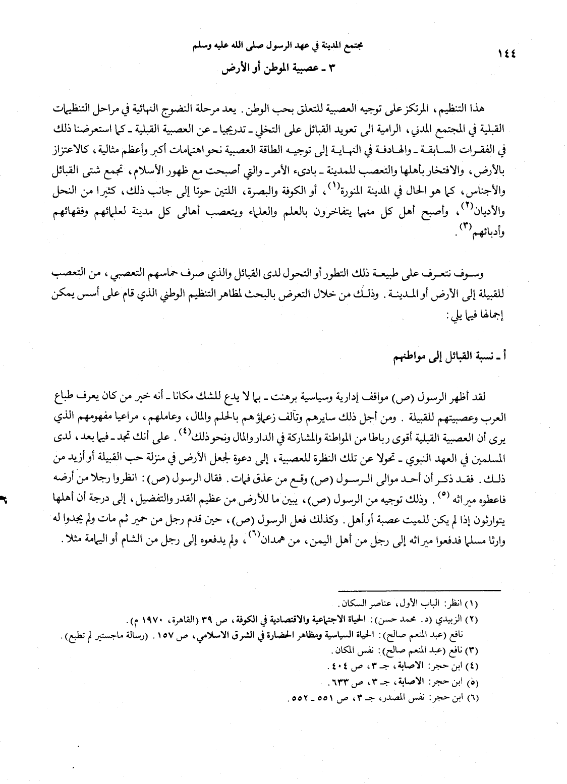 144…3 - عصبية الموطن أو الأرض هذا التنظيم، المرتكز على توجيه العصبية للتعلق بحب الوطن. يعد مرحلة النضوج النهائية في مراحل التنظيمات القبلية في المجتمع المدني، الرامية إلى تعويد القبائل على التخلي - تدريجياً - عن العصبية القبلية - كما استعرضنا ذلك في الفقرات السابقة - والهادف في النهاية إلىتوجيه الطاقة العصبية نحو اهتماما أكبر وأعظم مثالية، كالاعتزاز بالأرض، والافتخار بأهلها والتعصب للمدينة - بادئ الأمر - والتي أصبحت مع ظهور الإسلام، تجمع شتى القبائل والأجناس، كما هو الحال في المدينة المنورة (1)، أو الكوفة والبصرة، اللتين حوتا إلى جانب ذلك، كثيراً من النحل والأديان (2)، وأصبح أهل كل منهما يتفاخرون بالعلم والعلماء ويتعصب أهالي كل مدينة لعلمائهم وفقهائهم وادبائهم (3). وسوف نتعرف على طبيعة ذلك التطور أوالتحول لدى القبائل والذي صرف حماسهم التعصبي، من التعصب للقبيلة إلى الأرض أو المدينة. وذلك من خلال التعرض بالبحث لمظاهر التنظيم الوطني الذي قام على أسس يمكن إجمالها فيما يلي: أ- نسبة القبائل إلى مواطنهم لقد أظهر الرسول صلى الله عليه وسلم مواقف إدارية وسياسية برهنت - بمالا يدع للشك مكاناً - أنه خير من كان يعرف طباع العرب وعصبيتهم للقبيلة. ومن أجل ذلك سايرهم وتآلف زعماؤهم بالحلم والملا، وعاملهم، مراعياً مفهومهم الذي يرى أن العصبية القبلية أقوى رباطاً من المواطنة والمشاركة في الدار والمال ونحو ذلك (4). على أنك تجد - فيما بعد، لدى المسلمين في العهد النبوي - تحولاً عن تلك النظرة للعصبية، إلى دعوة لجعل الأرض في منزلة حب القبيلة أو أزيد من ذلك. فقد ذكر أن أحد موالي الرسول صلى الله عليه وسلم وقع من عذق فمات. فقال الرسول (ص): انظروا رجلاً منأرضه فاعطوه ميراثه (5). وذلك توجيه من الرسول صلى الله عليه وسلم، يبين ما للأرض من عظيم القدر والتفضيل، إلى درجة أن أهلها يتوارثون إذا لم يكن للميت عصبة أو أهل. وكذلك فعل الرسول صلى الله عليه وسلم، حين قدم رجل من حمير ثم مات ولم يجدوا له وارثاً مسلماً فدفعوا ميراثه إلى رجل من أهل اليمن، من همدان (6)، ولم يدفعوه إلى رجل من الشام أو اليمامة مثلاً.…