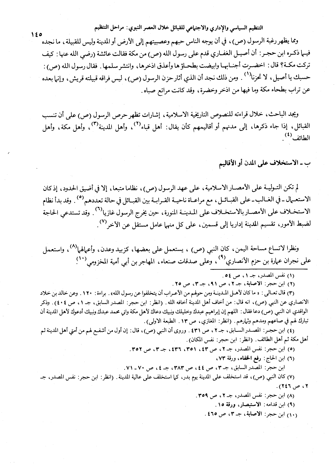 145…ومما يظهر رغبة الرسول صلى الله عليه وسلم، في أن يوجه الناس حبهم وعصبيتهم إلى الأرض أو المدينة وليس للقبيلة، ما نجده فيما ذكره ابن حجر: أن أصيل الغفاري قدم على رسول الله صلى الله عليه وسلم من مكة فقالت عائشة (رضي الله عنها: كيف تركت مكة؟ قال: أخضرت أجنابها وابيضت بطحاؤها وأعذق اذخرها، وانتشر سلمها. فقال رسول الله صلى الله عليه وسلم : حسبك يا أصيل، لا تحزنا (1). ومن ذلك نجد أن الذي أثار حزن الرسول صلى الله عليه وسلم، ليس فراقه قبيلته قريش، وإنا بعده عن تراب بطحاء مكة وما فيها من اذخر وخضرة، وقد كانت مراتع صباه. ويجد الباحثن خلال قراءته للنصوص التاريخية الإسلامية، إشارات تظهر حرص الرسول صلى الله عليه وسلم على أن تنسب القبائل، إذا جاء ذكرها، إلى مدنهم أو أقاليمهم كأن يقال: أهل قباء (2)، وأهل المدينة (3)، وأهل مكة، وأهل الطائف (4). ب- الاستخلاف على المدن أو الأقاليم لم تكن التولية على الأمصار الإسلامية، على عهد الرسول صلى الله عليه وسلم، نظاماً متبعاً، إلا في أضيق الحدود، إذ كان الاستعمال - في الغالب - على القبائل، مع مراعاة ناحية القرابة بين القبائل في حالة تعددهم (5). وقد بدأ نظام الاستخلاف على الأمصار بالاستخلاف على المدينة المنورة، حين يخرج الرسول غازياً (6). وقد تستدعي الحاجة لضبط الأمور، تقسيم المدينة إدارياً إلى قسمين، على كل منهما عامل مستقل عن الآخر (7). ونظراً لاتساع مساحة اليمن، كان النبي صلى الله عليه وسلم، يستعمل على بعضها، كزبيد وعدن، وأعمالهما (8)، واستعمل على نجران عمارة بن حزم الأنصاري (9)، وعلى صدقات صنعاء، المهاجر بن أبي أمية المخزومي (10).…