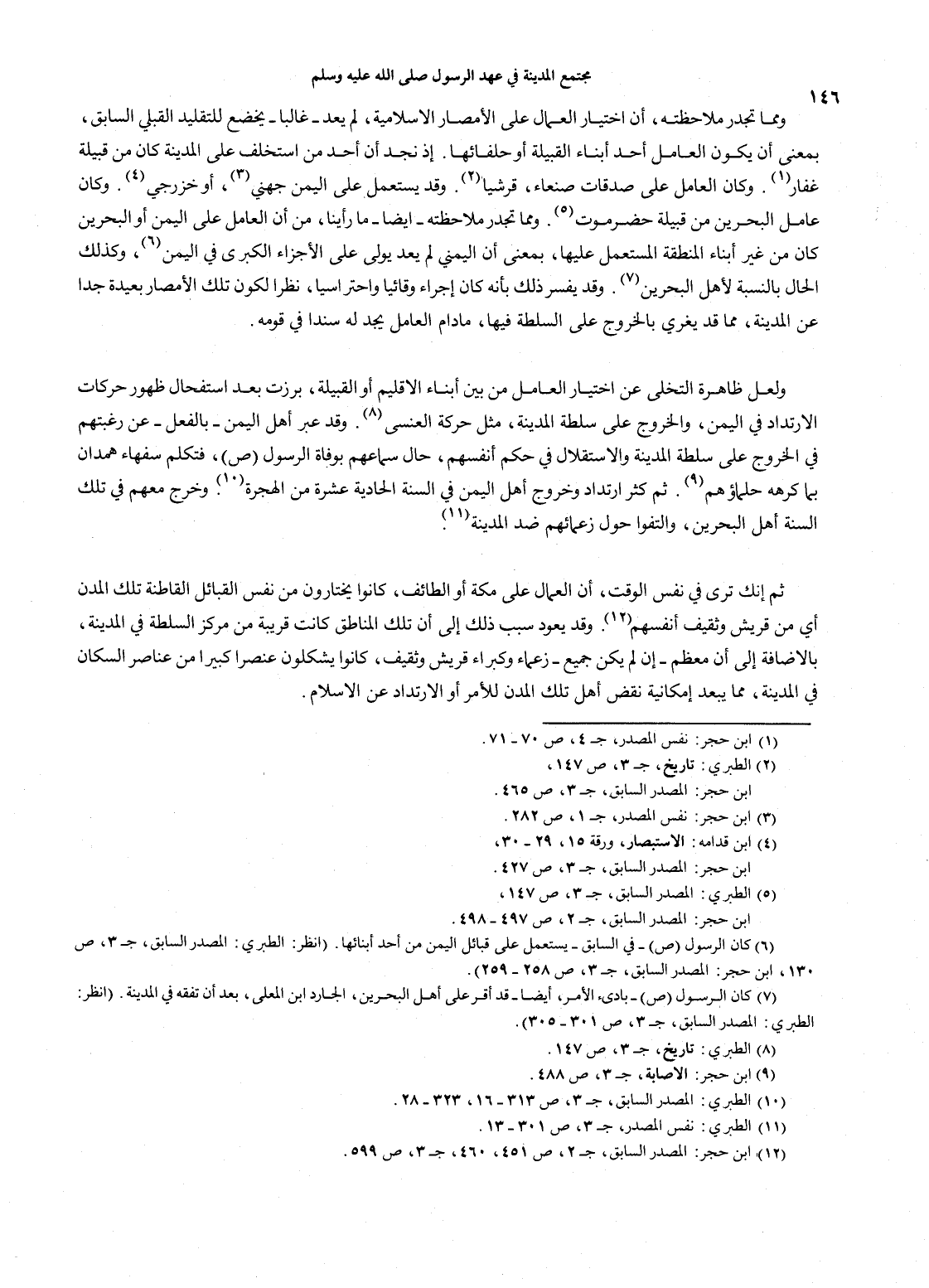 (1) ابن حجر: نفس المصدر، جـ4، ص70 - 71. (2) الطبري: تاريخ، جـ3، ص147. ابن حجر: المصدر السابق، جـ3، ص465. (3) ابن حجر: نفس المصدر، جـ1، ص282. (4) ابن قدامة: الاستبصار، ورقة 15، 29 - 30، ابن حجر: المصدر السابق، جـ3، ص427. (5) الطبري: المصدر السابق، جـ3، ص147، ابن حجر: المصدر السابق، جـ2، ص497 - 498. (6) كان الرسول صلى الله عليه وسلم - في السابق - يستعمل على قبائل اليمن من أحد أبنائها. (انظر: الطبري: المصدر السابق، جـ3، ص130، ابن حجر: المصدر السابق، جـ3، ص258 - 259). (7) كان الرسول صلى الله عليه وسلم - بادئ الأمر، أيضاً - قد أقر على أهل البحرين، الجارد ابن المعلي، بعد أن تفقه في المدينة. (انظر: الطبري: المصدر السابق، جـ3، ص301 - 305). (8) الطبري: تاريخ، جـ3، ص147. (9) ابن حجر: الإصابة، جـ3، ص488. (10) الطبري: المصدر السابق، جـ3، ص313 - 16، 323 - 28. (11) الطبري: نفس المصدر، جـ3، ص301 - 13. (12) ابن حجر: المصدر السابق، جـ2، ص451، 460، جـ3، ص599.