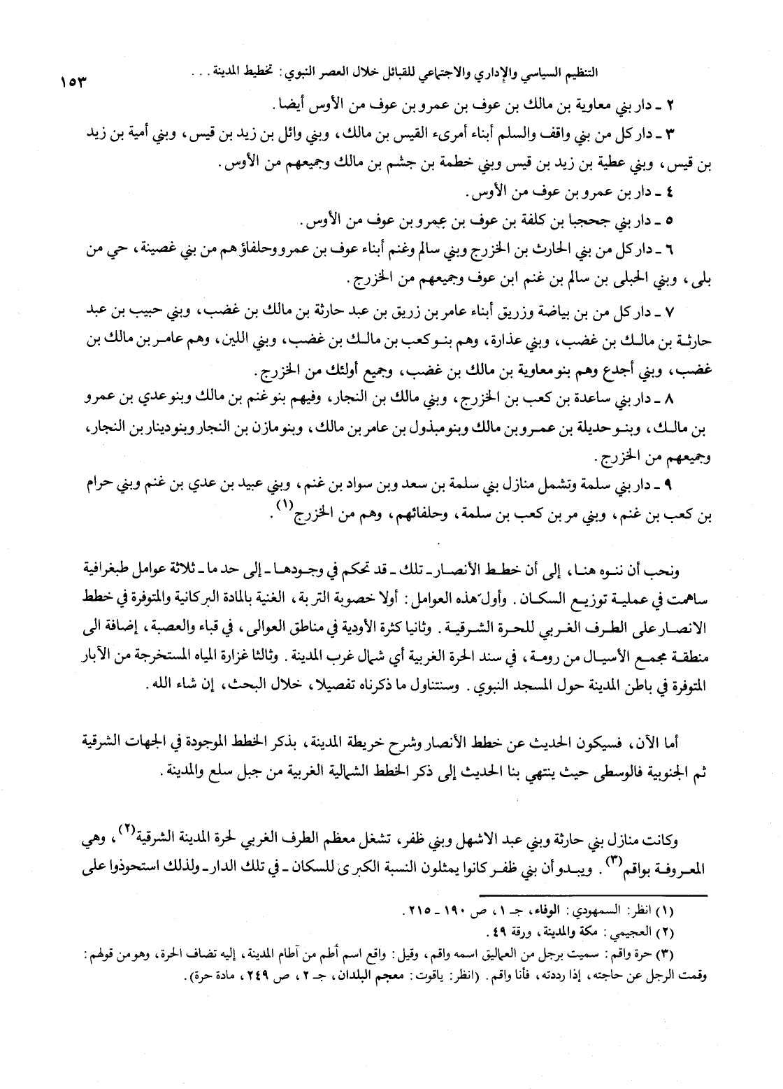 ونحب أن ننوه هنا، إلى أن خطط الأنصار - تلك - قد تحكم في وجودها - إلى حد ما - ثلاثة عوامل طبغرافية ساهمت في عملية توزيع السكان. وأول هذه العوامل: أولاً خصوبة التربة، الغنية بالمادة البركانية والمتوفرة في خطط الأنصار على الطرف الغربي للحرة الشرقية. وثانياً كثرة الأودية في مناطق العوالي، في قباء والعصبة، إضافة إلى منطقة مجمع الأسيال من رومة، في سند الحرة الغربية أي شمال غرب المدينة. وثالثاً غزارة المياه المستخرجة من الآبار المتوفرة في باطن المدينة حول المسجد النبوي. وسنتناول ما ذكرناه تفصيلاً، خلال البحث، إن شاء الله. أما الآن، فسيكون الحديث عن خطط الأنصار وشرح خريطة المدينة، بذكر الخطط الموجودة في الجهات الشرقية ثم الجنوبية فالوسطى حيث ينتهي بنا الحديث إلى ذكر الخطط الشمالية الغربية من جبل سلع والمدينة. وكانت منازل بني حارثة وبني عبد الأشهل وبني ظفر، تشغل معظم الطرف الغربي لحرة المدينة الشرقية (2)، وهي المعروفة بواقم (3). ويبدو أن بني ظفر كانوا يمثلون النسبة الكبرى للسكان - في تلك الدار - ولذلك استحوذوا على…