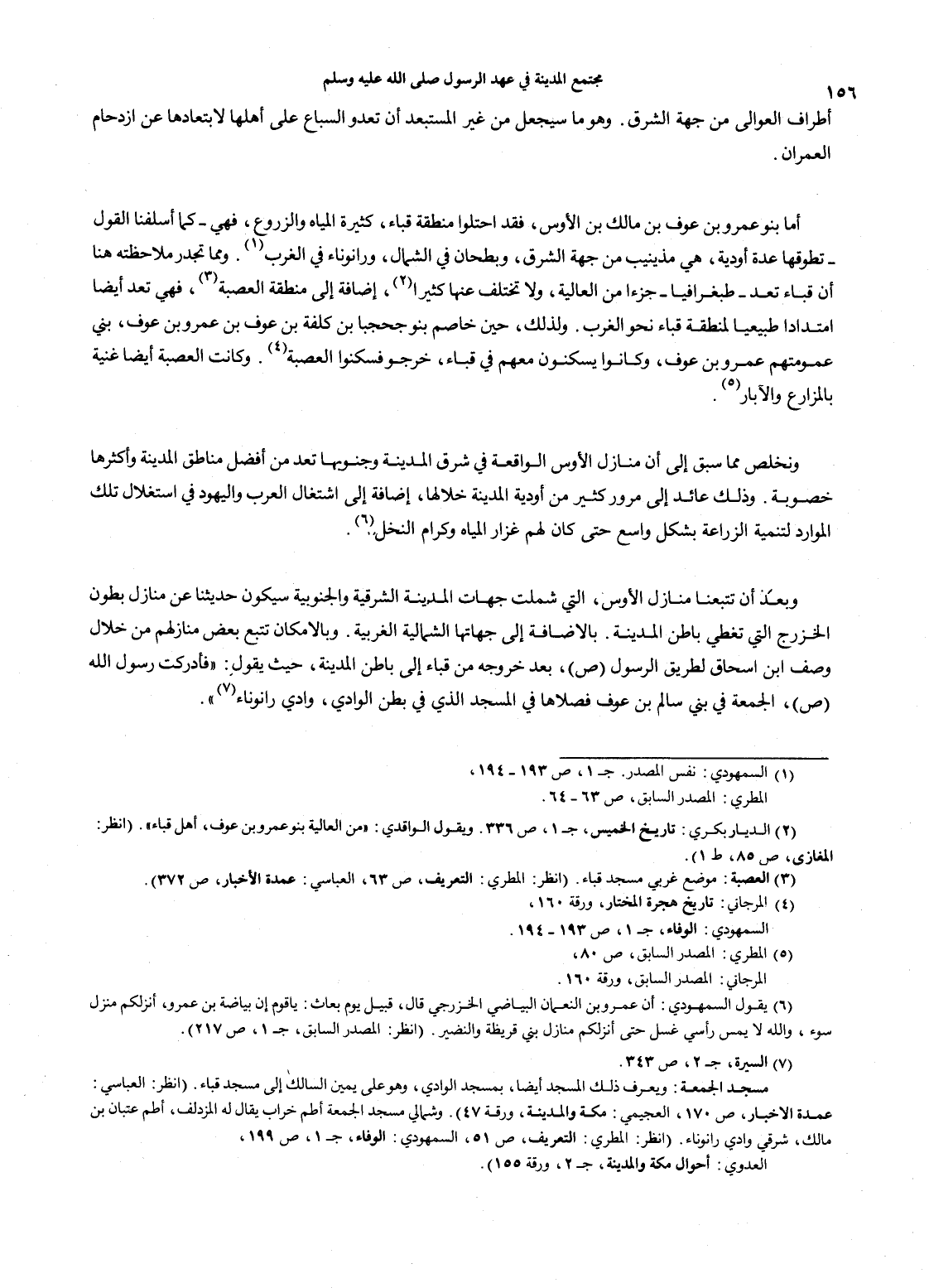(1) السمهودي: نفس المصدر. جـ1، ص193 - 194، الطري: المصدر السابق، ص63 - 64. (2) الديار بكري: تاريخ الخميس، جـ1، ص336. ويقول الواقدي: "من العالية بنو عمرو بن عوف، أهل قباء". (انظر: المغازي، ص85، ط1). (3) العصبة: موضع غربي مسجد قباء. (انظر: المطري: التعريف، ص63، العباسي: عمدة الأخبار، ص372). السمهودي: الوفاء، جـ1، ص193 - 194. (5) المطري: المصدر السابق، ص80، المرجاني: المصدر السابق، ورقة 160. (6) يقول السمهودي: أن عمرو بن النعمان البياضي الخرزجي قال، قبيل يوم بعاث: ياقوم إن بياضة بن عمرو، أنزلكم منزل سوء، والله لا يمس رأسي غسل حتى أنزلكم منازل بني قريظة والنضير. (انظر: المصدر السابق، جـ1، ص217). (7) السيرة، جـ2، ص343. مسجد الجمعة: ويعرف ذلك المسجد أيضاً، بمسجد الوادي، وهو على يمين السالك إلى مسجد قباء. (انظر: العباسي: عمدة الأخبار، ص170، العجيمي: مكة والمدينة، ورقة 47). وشمالي مسجد الجمعة أطم خراب يقال له المزدلف، أطم عتبان بن مالك، شرقي وادي رانوناء. (انظر: المطري: التعريف، ص51، السمهودي: الوفاء، جـ1، ص199، العدوي: أحوال مكة والمدينة، جـ2، ورقة 155).