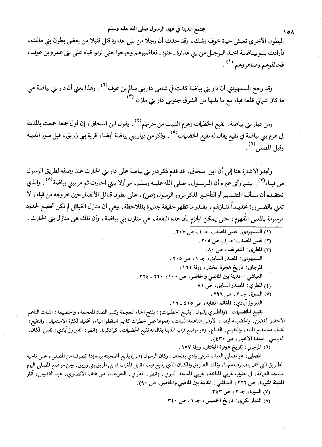 (1) السمهودي: نفس المصدر، جـ1، ص207. (2) نفس المصدر، جـ1، ص205. (3) المطري: التعريف، ص80، السمهودي: المصدر السابق، جـ1، ص205، المرجاني: تاريخ هجرة المختار، ورقة 161، العياشي: المدينة بين الماضي والحاضر، ص100، 220 - 224. (4) المطري: المصدر السابق، ص296، الفيروز آبادي: المغانم المطابه، ص415 - 16. نقيع الخضمات: (والمطري يقول: بقيع الخطمات): بفتح الخاء المعجمة وكسر الضاد المعجمة، والخضيمة: النبات الناعم الأخضر الغضن، والخضيمة أيضاً: الأرض الناعمة النبات، جمعوها على خطمات كأنهم أسقطوا الياء، تخفيفاً لكثرة الاستعمال. والنقيع: لغة، مستنقع الماء، والنقيع: القاع، وهو موضع قرب المدينة يقال له نقيع الخضمات، كما ذكرنا. (انظر: الفيروز آبادي: نفس المكان، العباسي: عمدة الأخبار، ص430). (6) المرجاني: تاريخ هجرة المختار، ورقة 157. المصلي: هو مصلى العيد، شرقي وادي بطحان. وكان الرسول صلى الله عليه وسلم يذبح أضحيته بيده إذا انصرف من المصلى، على ناحية الطريق التي كان ينصرف منها، وتلك الطرق والمكان الذي يذبح فيه، مقابل المغرب مما يلي طريق بني زريق. ومن مواضع المصلى اليوم مسجد الغمامة، في جنوب غربي المناخة، غربي المسجد النبوي. (انظر: المطري: التعريف، ص55، الأنصاري، عبد القدوس: آثار المدينة المنورة، ص222، العياشي: المدينة بين الماضي والحاضر، ص90). (7) السيرة، جـ2، ص343. (8) الديار بكري: تاريخ الخميس، جـ1، ص340.