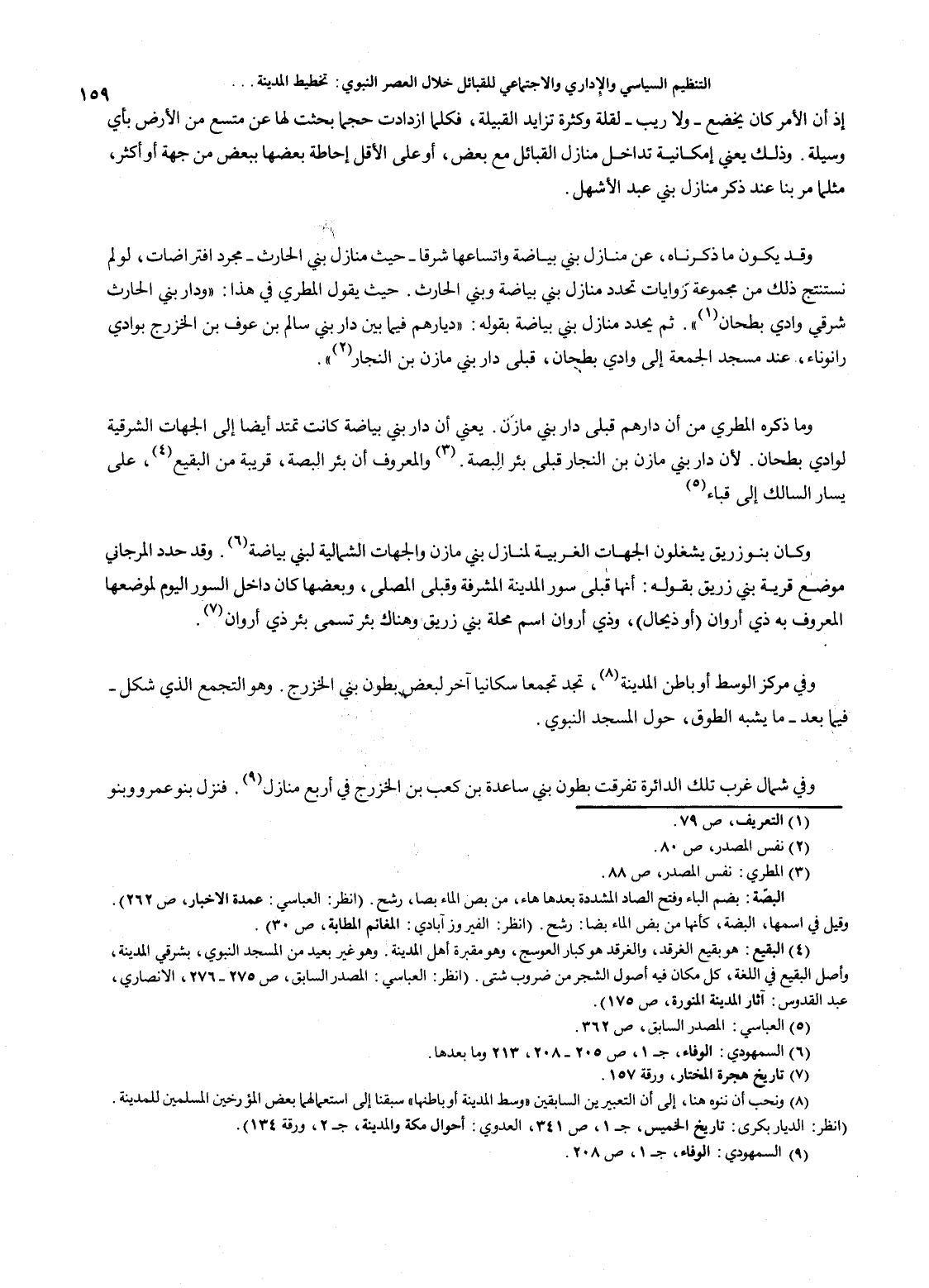 159…إذ أن الأمر كان يخضع - ولا ريب - لقلة وكثرة تزايد القبيلة، فكلما ازدادت حجماً بحثت لها عن متسع من الأرض بأي وسيلة. وذلك يعني إمكانية تداخل منازل القبائل مع بعض، أو على الأقل إحاطة بعضها ببعض من جهة أو أكثر، مثلما مر بنا عند ذكر منازل بني بعد الأشهل. وقد يكون ما ذكرناه، عن منازل بني بياضة واتساعها شرقاً - حيث منازل بني الحارث - مجرد افتراضات، لو لم نستنتج ذلك من مجموعة روايات تحدد منازل بني بياضة وبني الحارث. حيث يقول المطري في هذا: "ودار بني الحارث شرقي وادي بطحان (1) ". ثم يحدد منازل بني بياضة بقوله: "ديارهم فيما بين دار بني سالم بن عوف بن الخزرج بوادي رانوناء، عند مسجد الجمعة إلى وادي بطحان، قبلي دار بني مازن بن النجار (2) ". وما ذكره المطري من أن دارهم قبلي دار بني مازن. يعني أن دار بني بياضة كانت تمتد أيضاً إلى الجهات الشرقية لوادي بطحان. لأن دار بني مازن بن النجار قبلي بئر البصة (3). والمعروف أن بئر البصة، قريبة من البقيع (4)، على يسار السالك إلى قباء (5). وكان بنو زريق يشغلون الجهات الغربية لمنازل بني مازن والجهات الشمالية لبني بياضة (6). وقد حدد المرجاني موضع قرية بني زريق بقوله: أنها قبلي سور المدينة المشرفة وقبلي المصلى، وبعضها كان داخل السور اليوم لموضعها المعروف به ذي أروان (أو ذيحال)، وذي أروان اسم محلة بني زريق وهناك بئر تسمى بئر ذي أروان (7). وفي مركز الوسط أو باطن المدينة (8)، تجد تجمعاً سكانياً آخر لبعض بطون بني الخرزج. وهو التجمع الذي شكل - فيما بعد - ما يشبه الطوق، حول المسجد النبوي. وفي شمال غرب تلك الدائرة تفرقت بطون بني ساعدة بن كعب بن الخزرج في أربع منازل (9). فنزل بنو عمرو وبنو…