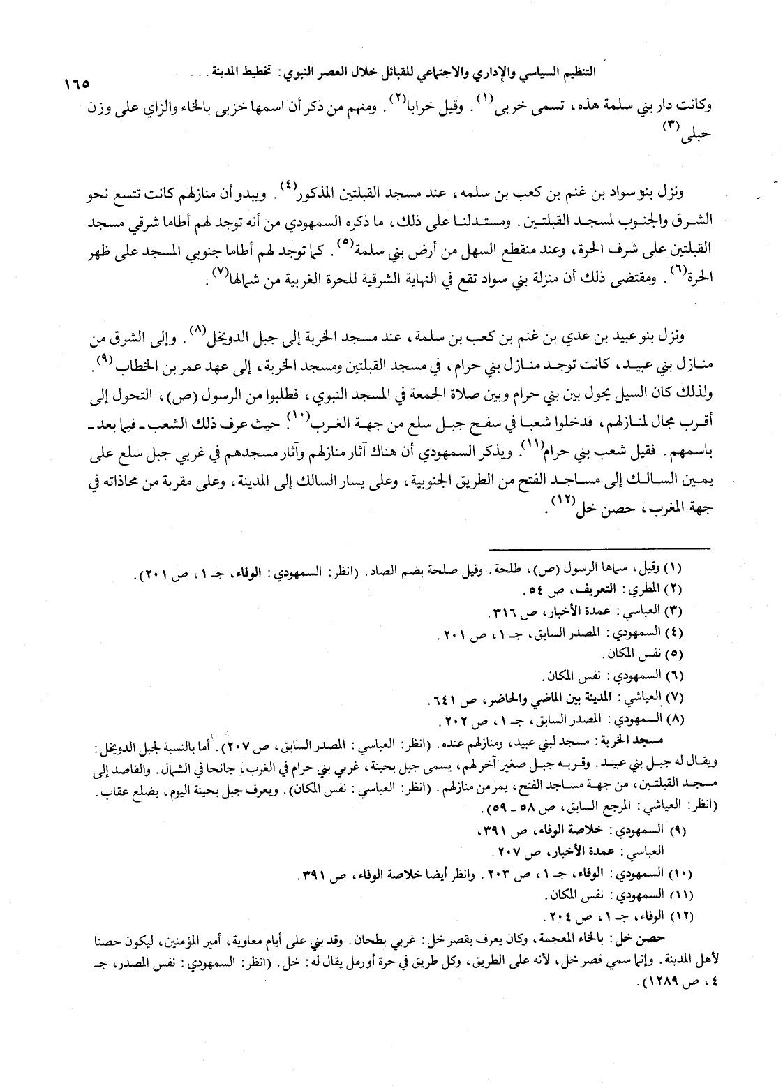 165…وكانت دار بني سلمة هذه، تسمى خربي (1). وقيل خراباً (2). ومنهم من ذكر أن اسمها خزبى بالخاء والزاي على وزن حبلى (3). ونزل بنو سواد بن غنم بن كعب بن سلمة، عند مسجد القبلتين المذكور (4). ويبدو أن منازلهم كانت تتسع نحو الشرق والجنوب مسجد القبلتين. ومستدلنا على ذلك، ما ذكره السمهودي من أنه توجد لهم أطاماً شرقي مسجد القبلتين على شرف الحرة، وعند منقطع السهل من أرض بني سلمة (5). كما توحد لهم أطاماً جنوبي المسجد على ظهر الحرة (6). ومقتضى ذلك أن منزلة بني سواد تقع في النهاية الشرقية للحرة الغربية من شمالها (7). ونزل بنو عبيد بن عدي بن غنم بن كعب بن سلمة، عند مسجد الخربة إلىجبل الدويخل (8). وإلى الشرق من منازل بني عبيد، كانت توجد منازل بني حرام، في مسجد القبلتين ومسجد الخربة، إلى عهد عمر بن الخطاب (9). ولذلك كان السيل يحول بين بني حرام وبين صلاة الجمعة في المسجد النبوي، فطلبوا من الرسول صلى الله عليه وسلم، التحول إلى أقرب مجال لمنازلهم، فدخلوا شعباً في سفح جبل سلع من جهة الغرب (20). حيث عرف ذلك الشعب - فيما بعد - باسمهم. فقيل شعب بني حرام (11). ويذكر السمهودي أن هناك آثار منازلهم وآثار مسجدهم في غربي جبل سلع على يمين السالك إلى مساجد الفتح من الطريق الجنوبية، وعلى يسار السالك إلى المدينة، وعلى مقربة من محاذاته في جهة المغرب، حصن خل (12).…