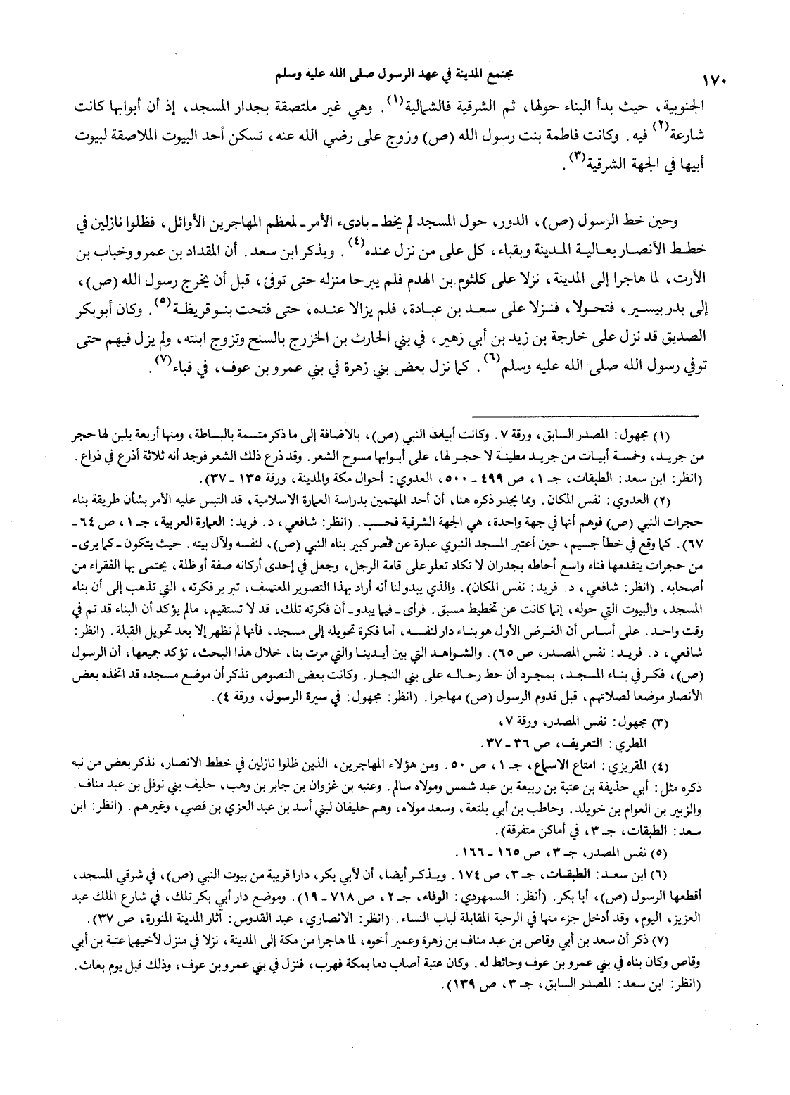 (1) مجهول: المصدر السابق، ورقة 7. وكانت أبيات النبي صلى الله عليه وسلم، بالإضافة إلى ما ذكر متسمة بالبساطة، ومنها أربعة بلبن لها حجر من جريد، وخمسة أبيات من جريد مطينة لا حجر لها، على أبوابها مسوح الشعر. وقد ذرع ذلك الشعر فوجد أنه ثلاثة أذرع في ذراع. (انظر: ابن سعد: الطبقات، جـ1، ص499 - 500، العدوي: أحوال مكة والمدينة، ورقة 135 - 37). (2) العدوي: نفس المكان. ومما يجدر ذكره هنا، أن أحد المهتمين بدراسة العمارة الإسلامية، قد التبس عليه الأمر بشأن طريقة بناء حجرات النبي صلى الله عليه وسلم فوهم أنها في جهة واحدة، هي الجهة الشرقية فحسب. (انظر: شافعي، د. فريد: العمارة العربية، جـ1، ص64 - 67). كما وقع في خطأ جسيم، حين اعتبر المسجد النبوي عبارة عن قصر كبير بناه النبي صلى الله عليه وسلم، لنفسه ولآل بيته. حيث يتكون - كما يرى - من حجرات يتقدمها فناء واسع أحاطه بجدران لا تكاد تعلو على قامة الرجل، وجعل في إحدى أركانه صفة أو ظلة، يحتمي بها الفقراء من أصحابه. (انظر: شافعي، د. فريد: نفس المكان). والذي يبدو لنا أنه أراد بهذا التصوير المتعسف، تبرير فكرته، التي تذهب إلى أن بناء المسجد، والبيوت التي حوله، إنما كانت عن تخطيط مسبق. فرأى - فيما يبدو - أن فكرته تلك، قد لا تستقيم، ما لم يؤكد أن البناء قد تم في وقت واحد. على أساس أن الغرض الأول هو بناء دار لنفسه، أما فكرة تحويله إلى مسجد، فإنها لم تظهر إلا بعد تحويل القبلة. (انظر: شافعي، د. فريد: نفس المصدر، ص65). والشواهد التي بين أيدينا والتي مرت بنا، خلال هذا البحث، تؤكد جميعها، أن الرسول صلى الله عليه وسلم، فكر في بناء المسجد، بمجرد أن حط رحاله على بني النجار. وكانت بعض النصوص تذكر أن موضع مسجده قد اتخذه بعض الأنصار موضعاً لصلاتهم، قبل قدوم الرسول صلى الله عليه وسلم مهاجراً. (انظر: مجهول: في سيرة الرسول، ورقة 4). (3) مجهول: نفس المصدر، ورقة 7، المطري: التعريف، ص36 - 37. (4) المقريزي: إمتاع الأسماع، جـ1، ص50. ومن هؤلاء المهاجرين، الذين ظلوا نازلين في خطط الأنصار، نذكر بعض من نبه ذكره مثل: أبي حذيفة بن عتبة بن ربيعة بن عبد شمس ومولاه سالم. وعتبة بن غزوان بن جابر بن وهب، حليف بني نوفل بن عبد مناف. والزبير بن العوام بن خويلد. وحاطب بن أبي بلتعة، وسعد مولاه، وهم حليفان لبني أسد بن عبد العزي بن قصي، وغيرهم. (انظر: ابن سعد: الطبقات، جـ3، في أماكن متفرقة). (5) نفس المصدر، جـ3، ص165 - 166. (6) ابن سعد: الطبقات، جـ3، ص174. ويذكر أيضاً، أن لأبي بكر، داراً قريبة من بيوت النبي صلى الله عليه وسلم، في شرقي المسجد، أقطعها الرسول صلى الله عليه وسلم، أبا بكر. (انظر: السمهودي: الوفاء، جـ2، ص718 - 19). وموضع دار أبي بكر تلك، في شارع الملك عبد العزيز، اليوم، وقد أدخل جزء منها في الرحبة المقابلة لباب النساء. (انظر: الأنصاري، عبد القدوس: آثار المدينة المنورة، ص37). (7) ذكر أن سعد بن أبي وقاص بن عبد مناف بن زهرة وعمير أخوه، لما هاجرا من مكة إلى المدينة، نزلا في منزل لأخيهما عتبة بن أبي وقاص وكان بناه في بني عمرو بن عوف وحائط له. وكان عتبة أصاب دماً بمكة فهرب، فنزل في بني عمرو بن عوف، وذلك قبل يوم بعاث. (انظر: ابن سعد: المصدر السابق، جـ3، ص139).