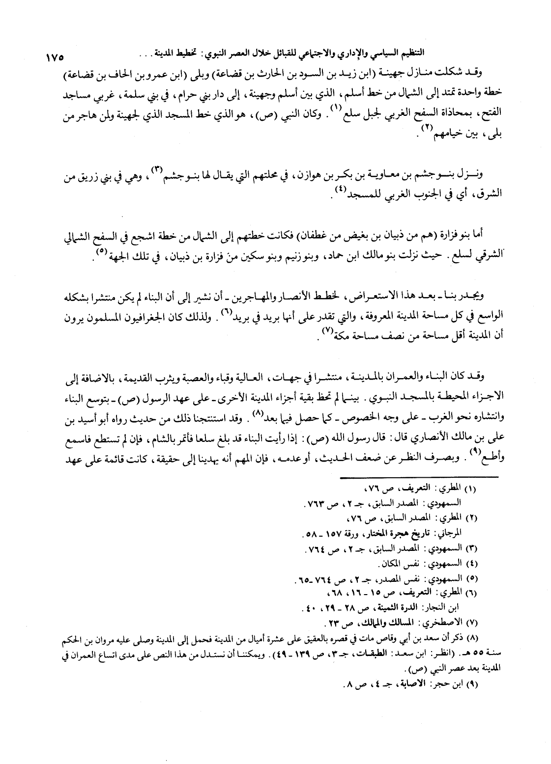 175…وقد شكلت منازل جهينة (ابن زيد بن السود بن الحارث بن قضاعة) وبلى (ابن عمرو بن الحاف بن قضاعة) خطة واحدة تمتد إلى الشمال من خط أسلم، الذي بين أسلم وجهينة، إلى دار بني حرام، في بني سلمة، غربي مساجد الفتح، بمحاذاة السفح الغربي لجبل سلع (1). وكان النبي 0ص)، هو الذي خط المسجد الذي لجهينة ولمن هاجر من بلى، بين خيامهم (2). ونزل بن وجشم بن معاوية بن بكر بن هوازن، في محلتهم التي يقال لها بنو جشم (3)، هي في بني زريق من الشرق، أي في الجنوب الغربي للمسجد (4). أما بنو فزارة (هم من ذبيان بن بغيض من غطفان) فكانت خطتهم إلى الشمال من خطة أشجع في السفح الشمالي الشرقي لسلع. حيث نزلت بنو مالك ابن حماد، وبنو زنيم وبنو سكين من فزارة بن ذبيان، في تلك الجهة (5). ويجدر بنا - بعد هذا الاستعراض، لخطط الأنصار والمهاجرين - أن نشير إلى أن البناء لم يكن منتشراً بشكله الواسع في كل مساحة المدينة المعروفة، والتي تقدر على أنها بريد في بريد (6). ولذلك كان الجغرافيون المسلمون يرون أن المدينة أقل مساحة من نصف مساحة مكة (7). وقد كان البناء والعمران بالمدينة، منتشراً في جهات، العالية وقباء والعصبة ويثرب القديمة، بالإضافة إلى الأجزاء المحيطة بالمسجد النبوي. بينما لم تخظ بقية أجزاء المدينة الأخرى - على عهد الرسول صلى الله عليه وسلم - بتوسع البناء وانتشاره نحو الغرب - على وجه الخصوص - كما حصل فيما بعد (8). وقد استنتجنا ذلك من حديث رواه أبو أسيد بن علي بن مالك الأنصاري قال: قال رسول الله صلى الله عليه وسلم : إذا رأيت البناء قد بلغ سلعاً فأتمر بالشام، فإن لم تستطع فاسمع وأطع (9). وبصرف النظر عن ضعف الحديث، أو عدمه، فإن المهم أنه يهدينا إلى حقيقة، كانت قائمة على عهد…