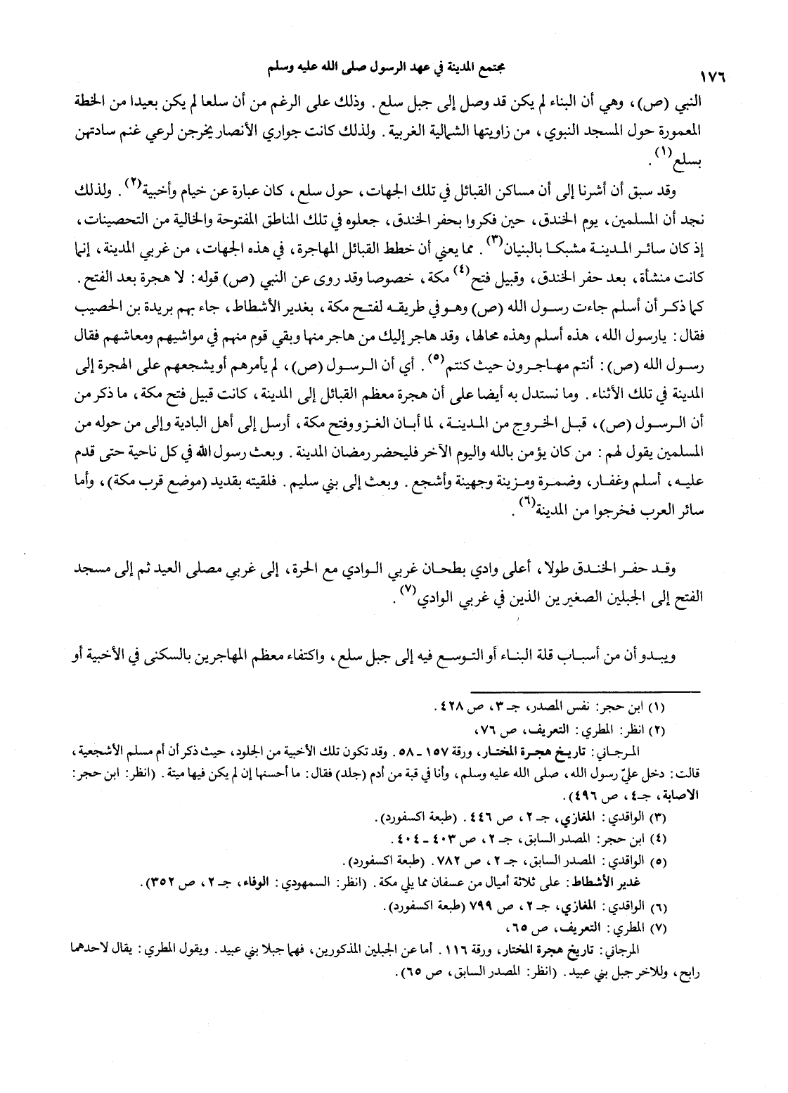 176…النبي صلى الله عليه وسلم، وهي أن البناء لم يكن قد وصل إلى حبل سلع. وذلك على الرغم من أن سلعاً لم يكن بعيداً من الخطة المعمورة حول المسجد النبوي، من زاويتها الشمالية الغربية. ولذلك كانت جواري الأنصار يخرجن لرعي غنم سادتهن بسلع (1). وقد سبق أن أشرنا إلى أن مساكن القبائل في تلك الجهات، حول سلع، كانت عبارة عن خيام وأخبية (2). وللك نجد أن المسلمين، يوم الخندق، حين فكروا بحفر الخندق، جعلوه في تلك المناطق المفتوحة والخالية من التحصينات، إذ كان سائر المدينة مشبكاً بالبنيان (3). مما يعني أن خطط القبائل الهاجرة، في هذه الجهات، من غربي المدينة، إنما كانت منشأة، بعد حفر الخندق، وقبيل فتح (4) مكة، خصوصاً وقد روى عن النبي صلى الله عليه وسلم قوله: لا هجرة بعد الفتح. كما ذكر أن أسلم جاءت رسول الله صلى الله عليه وسلم وهو في طريقه لفتح مكة، بغدير الأشطاط، جاء بهم بريدة بن الحصيب فقال: يا رسول الل، هذه أسلم وهذه محالها، وقد هاجر إليك من هاجر منها وبقي قوم منهم في مواشيهم ومعاشهم فقال رسول الله صلى الله عليه وسلم : أنتم مهاجرون حيث كنتم (5). أي أن الرسول صلى الله عليه وسلم، لم يأمرهم أو يشجعهم على الهجرة إلى المدينة في تلك الأثناء. وما نستدل به أيضاً على أن هجرة معظم القبائل إلى المدينة، كانت قبيل فتح مكة، ما ذكر من أن الرسول صلى الله عليه وسلم، قبل الخروج من المدينة، لما أبان الغزو وفتح مكة، أرسل إلى أهل البادية وإلى من حوله من المسلمين يقول لهم: من كان يؤمن بالله واليوم الآخر فليحضر رمضان المدينة. وبعث رسول الله في كل ناحية حتى قدم عليه، أسلم وغفار، وضمرة ومزينة وجهينة وأشجع. وبعث إلى بني سليم. فلقيته بقديد (موضع قرب مكة)، وأما سائر العرب فخرجوا من المدينة (6). وقد حفر الخندق طولاً، أعلى وادي بطحان غربي الوادي مع الحرة، إلى غربي مصلى العيد ثم إلى مسجد الفتح إلى الجبلين الصغيرين الذين في غربي الوادي (7). ويبدو أن من أسباب قلة البناء أو التوسع فيه إلى جبل سلع، واكتفاء معظم المهاجرين بالسكنى في الأخبية أو…