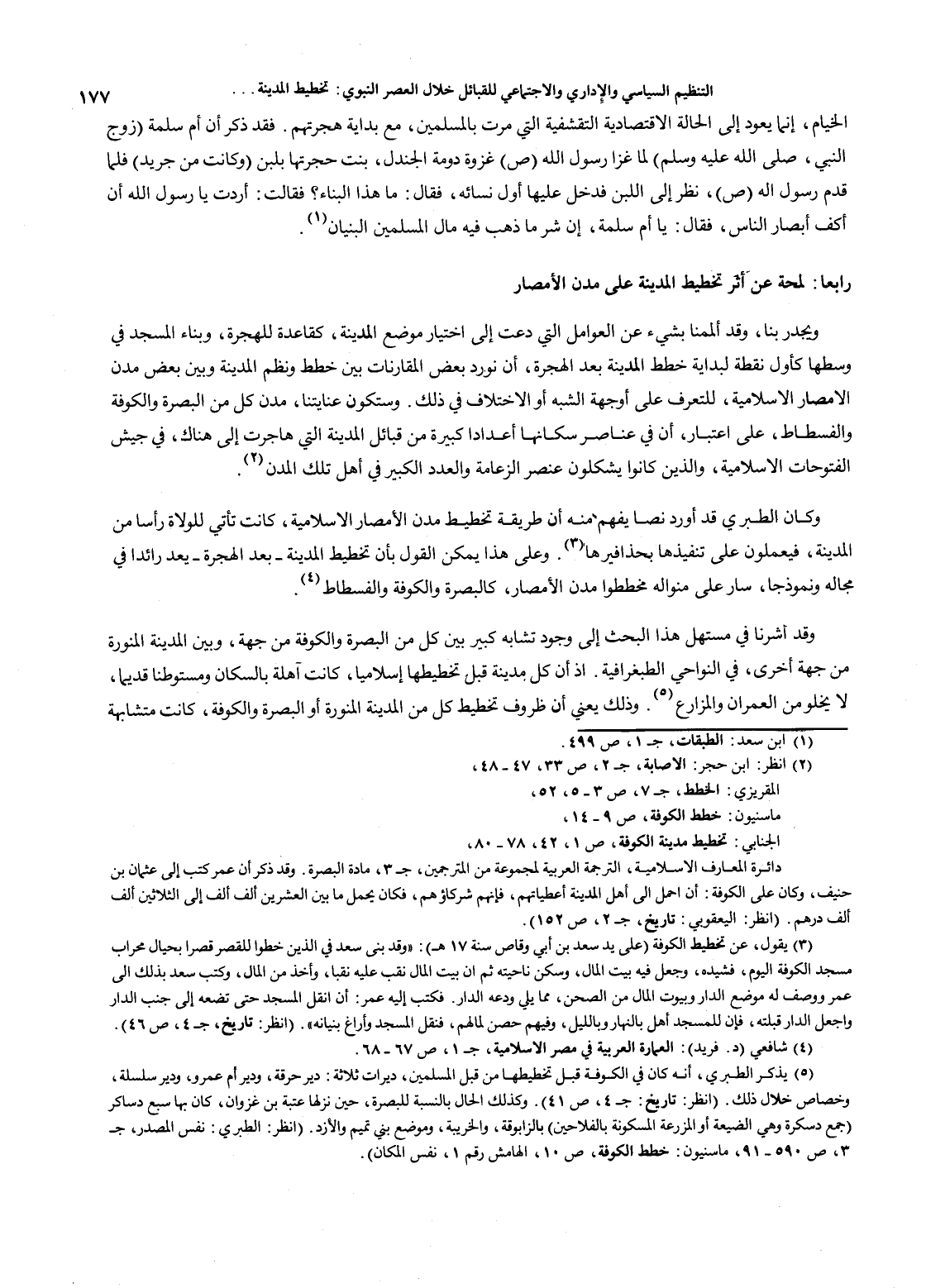 177…الخيام، إنما يعود إلى الحالة الاقتصادية التقشفية التي مرت بالمسلمين، مع بداية هجرتهم. فقد ذكر أن أم سلمة (زوج النبي، صلى الله عليه وسلم) لما غزا رسول الله صلى الله عليه وسلم غزوة دومة الجندل، بنت حجرتها بلبن (وكانت من جريد) لما قدم رسول الله صلى الله عليه وسلم، نظر إلى اللبن فدخل عليها أول نسائه، فقال: ما هذا البناء؟ فقالت: أردت يا رسول الله أن أكف أبصار الناس، فقال: يا أم سلمة، إن شر ما ذهب فيه مال المسلمين البنيان (1). رابعاً: لمحة عن أثر تخطيط المدينة على مدن الأمصار ويجدر بنا، وقد ألممنا بشيء عن العوامل التي دعت إلى اختيار موضع المدينة، كقادة للهجرة، وبناء المسجد في وسطها كأول نقطة لبداية خطط المدينة بعد الهجرة، أن نورد بعض المقارنات بين خطط ونظم المدينة وبين بعض مدن الأمصار الإسلامية، للتعرف على أوجهة الشبه أو الاختلاف في ذلك. وستكون عنايتنا، مدن كل من البصرة والكوفة والفسطاط، على اعتبار، أن من عناصر سكانها أعداداً كبيرة من قبائل المدينة التي هاجرت إلى هناك، في جيش الفتوحات الإسلامية، والذين كانوا يشكلون عنصر الزعامة والعدد الكبير في أهل تلك المدن (2). وكان الطبري قد أورد نصاً يفهم منه أن طريقة تخطيط مدن الأمصار الإسلامية، كانت تأتي للولاة رأساً من المدينة، فيعلمون على تنفيذها بحذافيرها (3). وعلى هذا يمكن القول بأن تخطيط المدينة - بعد الهجرة - يعد رائداً في مجاله ونموذجاً، سار على منواله مخططوا مدن الأمصار، كالبصرة والكوفة والفسطاط (4). وقد أشرنا في مستهل هذا البحث إلى وجود تشابه كبير بين كل من البصرة والكوفة من جهة، وبين المدينة المنورة من جهة أخرى، في النواحي الطبغرافية. إذ أن كل مدينة قبل تخطيطها إسلامياً، كانت آهلة بالسكان ومستوطناً قديماً، لا يخلو من العمران والمزارع (5). وذلك يعني أن ظروف تخطيط كل من المدينة المنورةأ و البصرة والكوفة، كانت متشابهة…