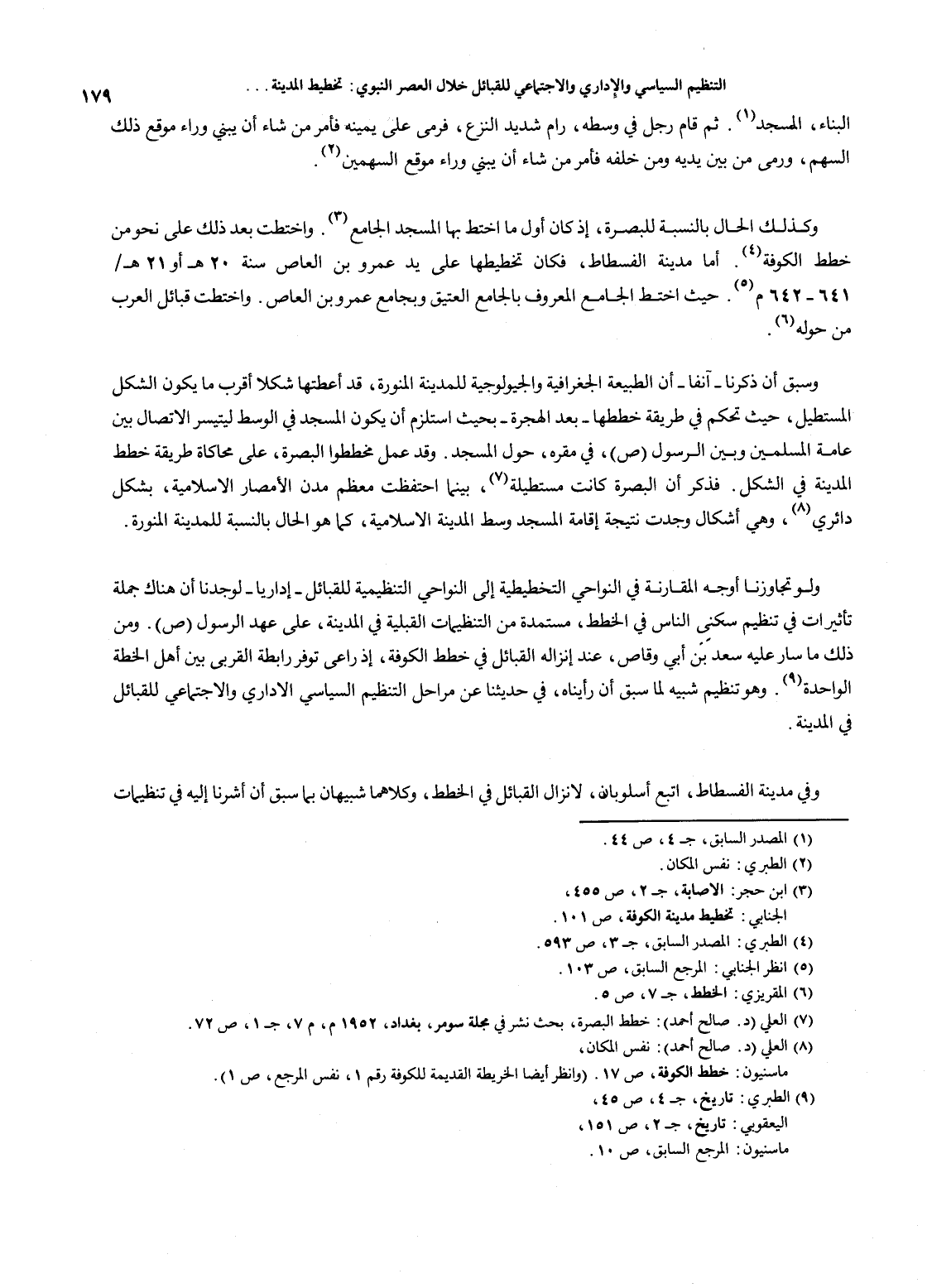 179…البناء، المسجد (1). ثم قام رجل في وسطه، رام شديد النزع، فرمى على يمينه فأمر من شاء أن يبني وراء موقع ذلك السهم، ورمى من بين يديه ومن خلفه فأمر من شاء أن يبني وراء موقع السهمين (2). وكذلك الحال بالنسبة للبصرة، إذ كان أول ما اختط بها المسجد الجامع (3). واختطت بعد ذلك على نحو من خطط الكوفة (4). أما مدينة الفسطاط، فكان تخطيطها على يد عمرو بن العاص سنة 20هـ أو 21هـ / 641 - 642م (5). حيث اختط الجامع المعروف بالجامع العتيق وبجامع عمرو بن العاص. واختطت قبائل العرب من حوله (6). وسبق أن ذكرنا - آنفاً - أن الطبيعة الجغرافية والجيولوجية للمدينة المنورة، قد أعطتها شكلاً أقرب ما يكون الشكل المستطيل، حيث تحكم في طريقة خططها - بعد الهجرة - بحيث استلزم أن يكون المسجد في الوسط ليتيسر الاتصال بين عامة المسلمين وبين الرسول صلى الله عليه وسلم، في مقره، حول المسجد. وقد عمل مخططوا البصرة، على محاكاة طريقة خطط المدينة في الشكل. فذكر أن البصرة كانت مستطيلة (7)، بينما احتفظت معظم مدن الأمصار الإسلامية، بشكل دائري (8)، وهي أشكال وجدت نتيجة إقامة المسجد وسط المدينة الإسلامية، كما هو الحال بالنسبة للمدينة المنورة. ولو تجاوزنا أوجه المقارنة في النواحي التخطيطية إلى النواحي التنظيمية للقبائل - إدارياً - لوجدنا أن هناك جملة تاثيرات في تنظيم سكنى الناس في الخط، مستمدة من التنظيمات القبلية في المدينة، على عهد الرسول (ص). ومن ذلك ما سار عليه سعد بن أبي وقاص، عند إنزاله القبائل في خطط الكوفة، إذ راعى توفر رابطة القربى بين أهل الخطة الواحدة (9). وهو تنظيم شبيه لما سبق أن رأيناه، في حديثنا عن مراحل التنظيم السياسي الإداري والاجتماعي للقبائل في المدينة. وفي مدينة الفسطاط، اتبع أسلوبان، لإنزال القبائل في الخطط، وكلاهما شبيهان بما سبق أن أشرنا إليه في تنظيمات…