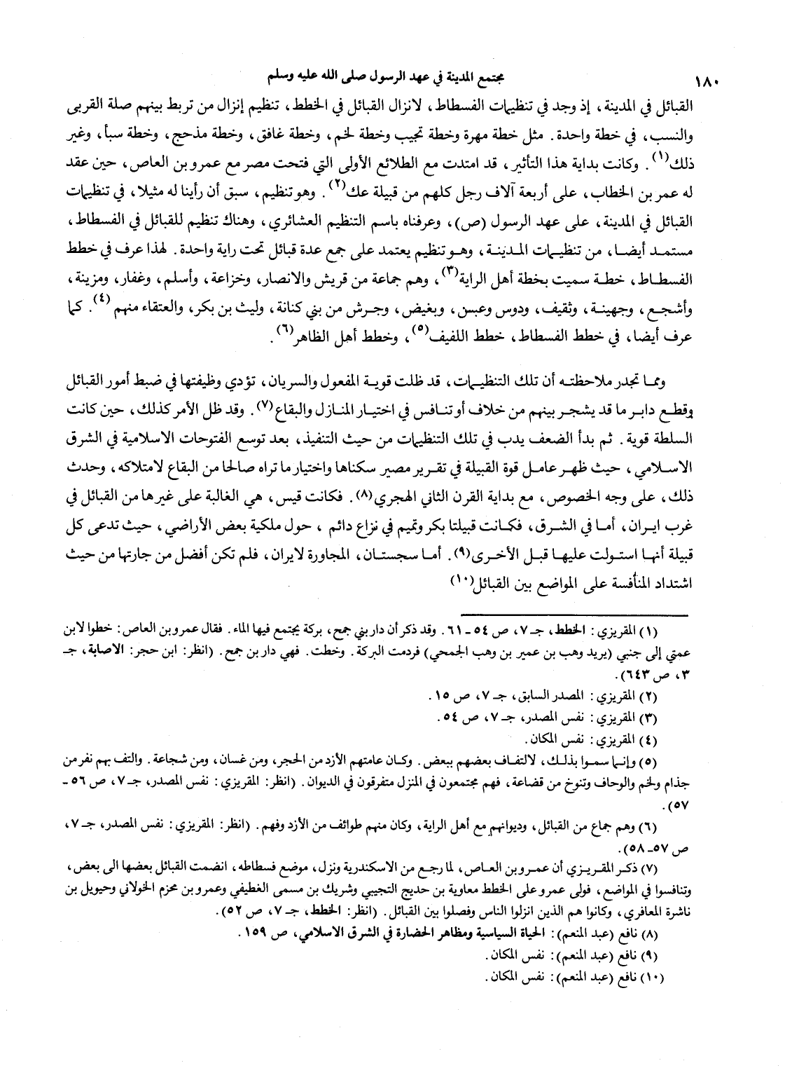 (1) المقريزي: الخطط، جـ7، ص54 - 61. وقد ذكر أن دار بني جمح، بركة يجتمع فيها الماء. فقال عمرو بن العاص: خطوا لابن عمتي إلى جنبي (يريد وهب بن عمير بن وهب الجمحي) فردمت البركة. وخطت. فهي دار بن جمح. (انظر: ابن حجر: الإصابة، جـ3، ص643). (2) المقريزي: المصدر السابق، جـ7، ص15. (3) المقريزي: نفس المصدر، جـ7، ص54. (4) المقريزي: نفس المكان. (5) وإنما سموا بذلك، لالتفاف بعضهم ببعض. وكان عامتهم الأزد من الحجر، ومن غسان، ومن شجاعة. والتف بهم نفر من جذام ولخم والوحاف وتنوخ من قضاعة، فهم مجتمعون في المنزل متفرقون في الديوان. (انظر: المقريزي: نفس المصدر، جـ7، ص56 - 57). (6) وهم جماع من القبائل، وديوانهم مع أهل الراية، وكان منهم طوائف من الأزد وفهم. (انظر: المقريزي: نفس المصدر، جـ7، ص57 - 58). (7) ذكر المقريزي أن عمرو بن العاص، لما رجع من الإسكندرية ونزل، موضع فسطاطه، انضمت القبائل بعضها إلى بعض، وتنافسوا في المواضع، فولى عمرو على الخطط معاوية بن حديج التجيبي وشريك بن مسمىالغطيفي وعمرو بن محزم الخولاني وحيويل بن ناشرة المعافري، وكانوا هم الذين أنزلوا الناس وفصلوا بين القبائل. (انظر: الخطط، جـ7، ص52). (8) نافع (عبد المنعم): الحياة السياسية ومظاهر الحضارة في الشرق الإسلامي، ص159. (9) نافع (عبد المنعم): نفس المكان. (10) نافع (عبد المنعم): نفس المكان.