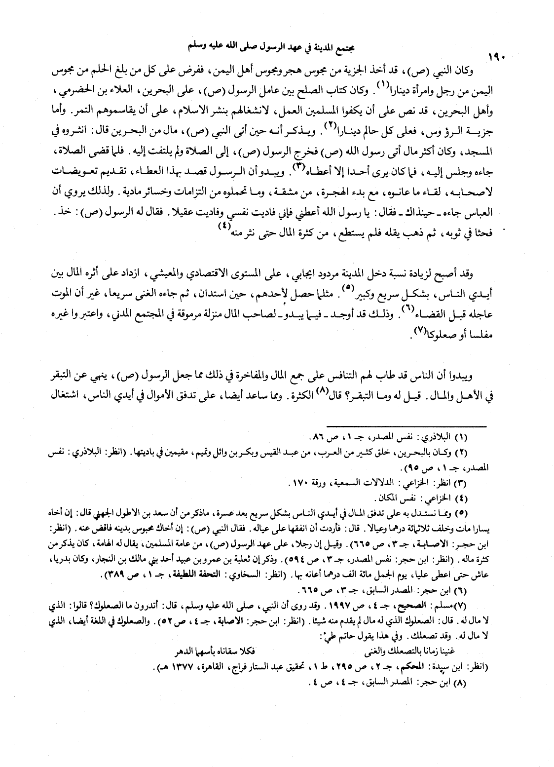 190…وكان النبي صلى الله عليه وسلم، قد أخذ الجزية من مجوس هجر ومجوس أهل اليمن، ففرض على كل من بلغ الحلم من مجوس اليمن من رجل وامرأة ديناراً (1). وكان كتاب الصلح بين عامل الرسول صلى الله عليه وسلم، على البحرين، العلاء بن الحضرمي، وأهل البحرين، قد نص على أن يكفوا المسلمين العمل، لانشغالهم بنشر الإسلام، على أن يقاسموهم التمر. واما المسجد، وكان أكثر مال أتى رسول الله صلى الله عليه وسلم فخرج الرسول صلى الله عليه وسلم، إلى الصلاة ولم يلتفت إليه، فلما قضى الصلاة، لأصحابه، لقاء ما عانوه، مع بدء الهجرة، من مشقة، وما تحملوه من التزامات وخسائر مادية. ولذلك يروي أن العباس جاءه - حينذاك - فقال: يا رسول الله أعطني فإني فاديت نفسي وافديت عقيلاً. فقال له الرسول (ص): خذ. فحثا في ثوبه، ثم ذهب يقله فلم يستطع، من كثرة المال حتى نثر منه (4). وقد أصبح لزيادة نسبة دخل المدينة مردود إيجابي، على المستوى الاقتصادي والمعيشي، ازداد على أثره المال بين أيدي الناس، بشكل سريع وكبير (5). مثلما حصل لأحدهم، حين استدان، ثم جاءه الغني سريعاً، غير أن الموت عاجله قبل القضاء (6). وذلك قد أوجد - فيما يبدو - لصاحب المال منزلة مرموقة في المجتمع المدني، واعتبروا غيره مفلساً أو صعلوكاً (7). ويبدو أن الناس قد طاب هلم التنافس على جمع المال والمفاخرة في ذلك ما جعل الرسول صلى الله عليه وسلم، ينهي عن التبقر في الأهل والمال. قيل له وما التبقر؟ قال (8) الكثرة. ومما ساعد أيضاً، على تدفق الأموال في أيدي الناس، اشتغال…
