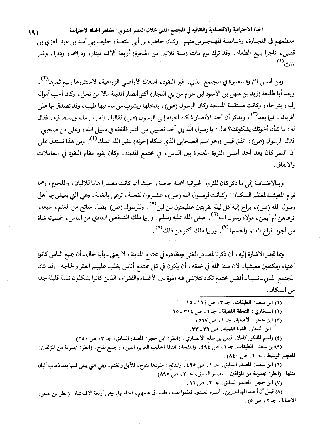 191…معظمهم في التجارة، وخاصة المهاجرين منهم. وكان حاطب بن أبي بلتعة، حليف بني أسد بن عبد العزي بن قصي، تاجراً يبيع الطعام. وقد ترك يوم مات (سنة ثلاثين من الهجرة) أربعة آلاف دينار، ودراهماً، وداراً، وغير ذلك (1). ومن أسس الثروة المعتبرة في المجتمع المدني، غير النقود، امتلاك الأراضي الزراعية، لاستثمارها وبيع ثمرها (2)، ويعد أبا طلحة (زيد بن سهل بن الأسود ابن حرام من بني النجار) أكثر أنصار المدينة مالاً من نخل، وكان أحب أمواله إليه، بئر حاء، وكانت مستقبلة المسجد وكان الرسول صلى الله عليه وسلم، يدخلها ويشرب من ماء فيها طيب، وقد تصدق بها على أقربائه، فيما بعد (3)، ويذكر أن أحد الأنصار شكاه أخوته إلى الرسول صلى الله عليه وسلم فقالوا: إنه يبذر ماله ويبسط فيه. فقال له: ما شأن اخوتك بشكونك؟ قال: يا رسول الله إني آخذ نصيبي من التمر فأنفقه في سبيل الله، وعلى من صحبني. فقال الرسول (ص): انفق قيس (وهو اسم الصحابي الذي شطكاه إخوته) ينفق الله عليك (4). ومن هذا نستدل على ان التمر كان يعد أحد أسس الثروة المعتبرة بين الناس، في مجتمع المدينة، وكان يقوم مقام النقود في المعاملات والإنفاق. وبالإضافة إلى ما ذكر كان للثروة الحيوانية أهمية خاصة، حيث أنها كانت مصدراً هاماً للألبان، واللحوم، وهما قوام المعيشة لمعظم السكان. وكانت لرسول الله صلى الله عليه وسلم، عشرون لقحة، ترعى بالغابة، وهي التي يعيش بها أهل رسول الله صلى الله عليه وسلم، يراح إليه كل ليلة بقربتين عظيمتين من لبن (5). وللرسول صلى الله عليه وسلم أيضاً، منائح من الغنم، سبعاً، ترعاهن أم أيمن، مولاة رسول الله (6)، صلى الله عليه وسلم. وربما ملك الشخص العادي من الناس، خمسمائة شاة من أجود أنواع الغنم وأحسنها (7). وربماملك أكثر من ذلك (8). ومما تجدر الإشارة إليه، أن ذكرنا لمصادر الغنى ومظاهره في مجتمع المدينة، لا يعني - بأية حال - أن جميع الناس كانوا أغنياء ومكتفين معيشياً، لأن سنة الله في خلقه، أن يكون في كل مجتمع أناس يغلب عليهم الفقر والحاجة. وقد كان المجتمع المدني - نسبياً - أفضل مجتمع تكاد تتلاشى فيه الهوة بين الأغنياء والفقراء، الذين كانوا يشكلون نسبة قليلة جداً من السكان.…