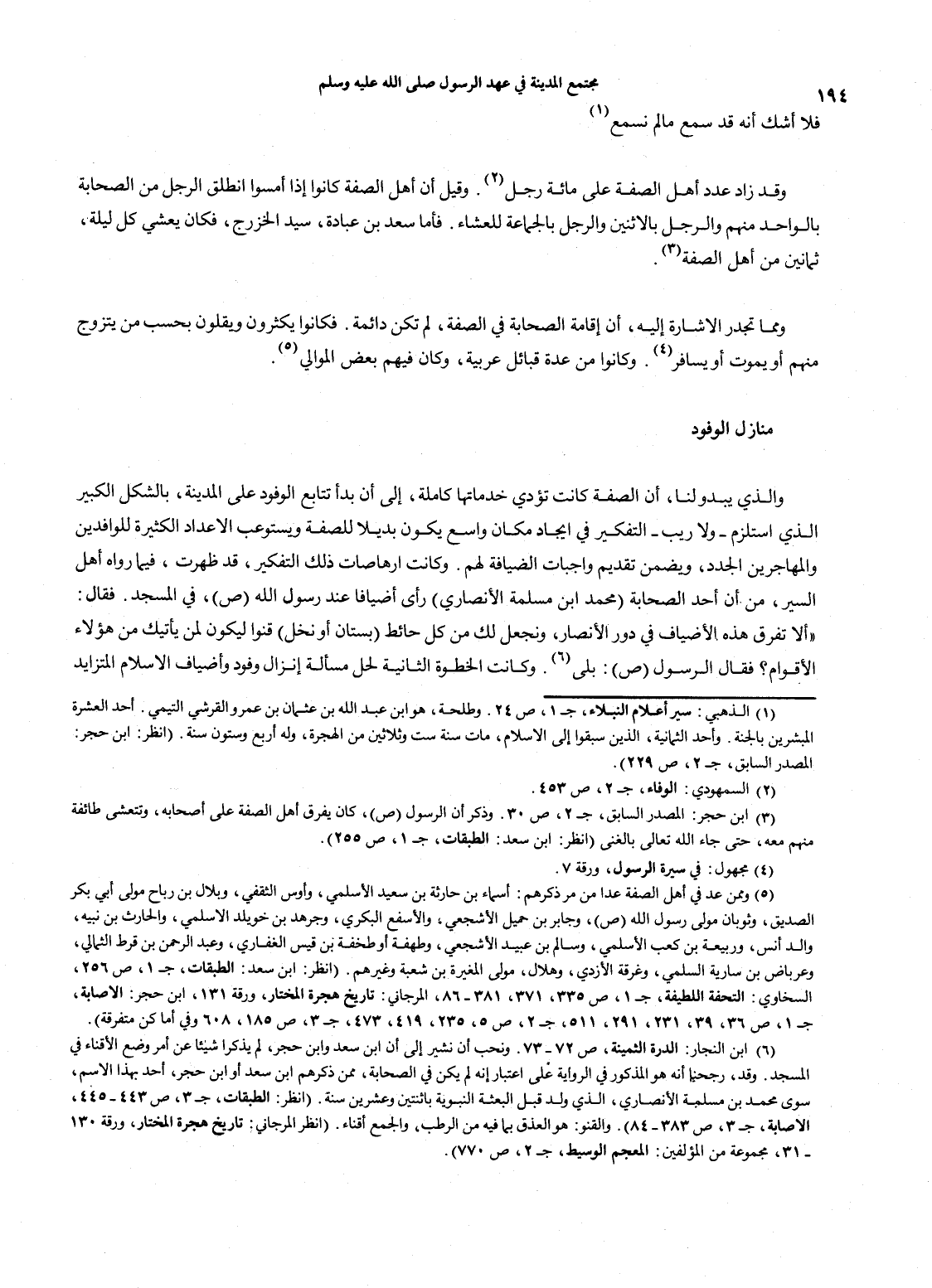 (1) الذهبي: سير أعلام النبلاء، جـ1، ص24. وطلحة، هو ابن عبدالله بنعثمان بن عمرو القرشي التيمي. أحد العشرة المبشرين بالجنة. وأحد الثمانية، الذين سبقوا إلى الإسلام، مات سنة ست وثلاثين من الهجرة، وله أربع وستون سنة. (انظر: ابن حجر: المصدر السابق، جـ2، ص229). (2) السمهودي: الوفاء، جـ2، ص453. (3) ابن حجر: المصدر السابق، جـ2، ص30. وذكر أن الرسول صلى الله عليه وسلم، كان يفرق أهل الصفة على أصحابه، وتتعشى طائفة منهم معه، حتى جاء الله تعالى بالغنى (انظر: ابن سعد: الطبقات، جـ1، ص255). (4) مجهول: في سيرة الرسول، ورقة 7. (5) وممن عد في أهل الصفة عدا من مر ذكرهم: أسماء بن حارثة بن سعيد الأسلمي، وأوس الثقفي، وبلال بن رباح مولى أبي بكر الصديق، وثوبان مولى رسول الله صلى الله عليه وسلم، وجابر بن حميل الأشجعي، والأسفع البكري، وجرهد بن خويلد الأسلمين والحارث بن نبيه، وعرباض بن سارية السلمي، وغرقة الأزدي، وهلال، مولى المغيرة بن شعبة وغيرهم. (انظر: ابن سعد: الطبقات، جـ1، ص256، السخاوي: التحفة اللطيفة، جـ1، ص335، 371، 381 - 86، المرجاني: تاريخ هجرة المختار، ورقة 131، ابن حجر: الإصابة، جـ1، ص36، 39، 231، 291، 511، جـ2، ص5، 235، 419، 473، جـ3، ص185، 608 وفي أماكن متفرقة). (6) ابن النجار: الدرة الثمينة، ص72 - 73. ونحب أن نشير إلى أن ابن سعد وابن حجر، لم يذكرا شيئاً عن أمر وضع الأقناء في المسجد. وقد، رجحنا أنه هو المذكور في الرواية على اعتبار إنه لم يكن في الصحابة، ممن ذكرهم ابن سعد أو ابن حجر، أحد بهذا الاسم، سوى محمد بن مسلمة الأنصاري، الذي ولد قبل البعثة النبوية البثنتين وعشرين سنة. (انظر: الطبقات، جـ3، ص443 - 445، الإصابة، جـ3، ص383 - 84). والقنو: هو العذق بما فيه من الرطب، والجمع أقناء. (انظر المرجاني: تاريخ هجرة المختار، ورقة 130 - 31، مجموعة من المؤلفين: المعجم الوسيط، جـ2، ص770).