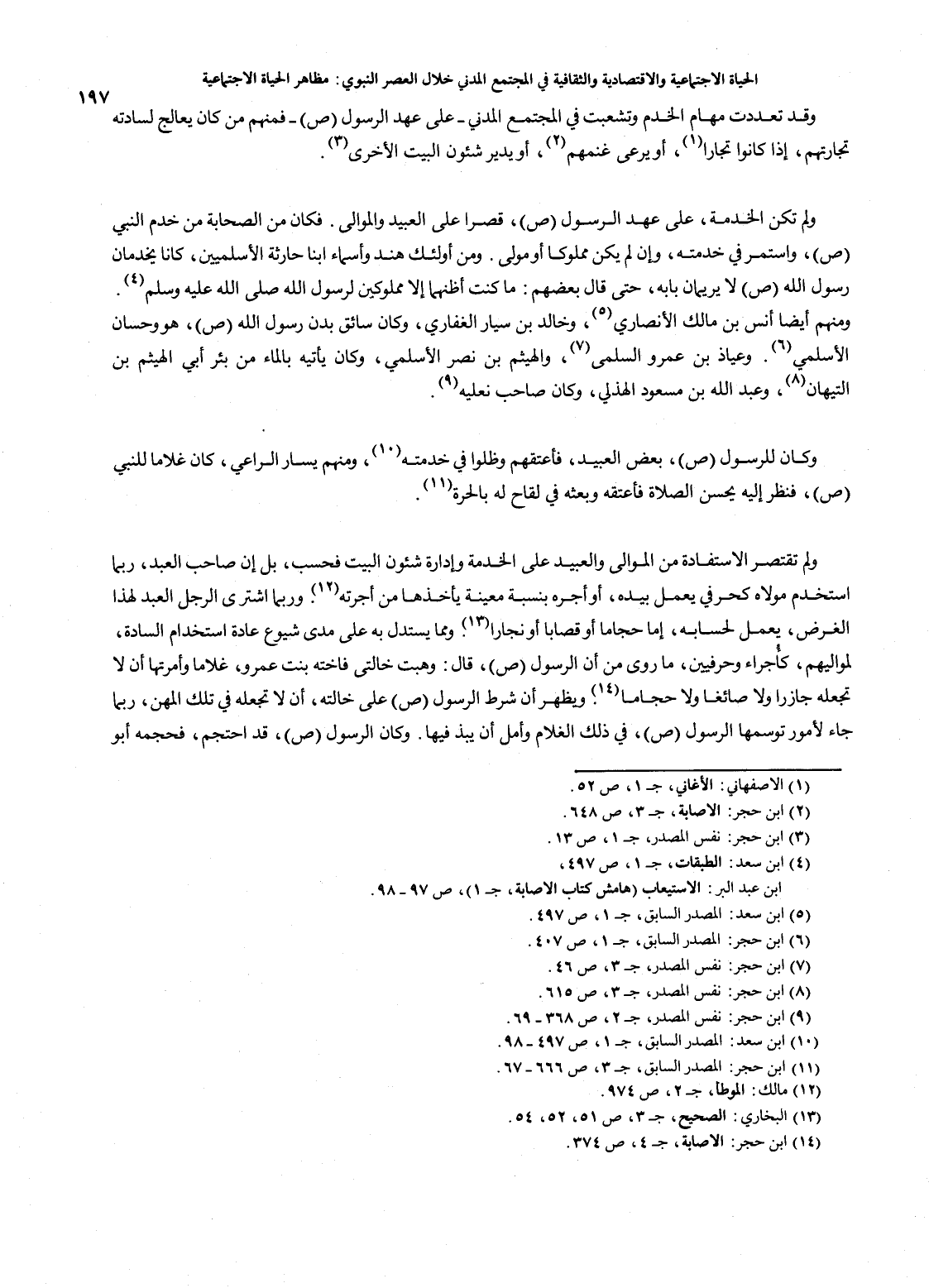 197…وقد تعددت مهام الخدم وتشعبت في المجتمع المدني - على عهد الرسول صلى الله عليه وسلم - فمنهم من كان يعالج لسادته تجارتهم، إذا كانوا تجاراً (1)، أويرع غنمهم (2)، أو يدير شؤون البيت الأخرى (3). ولم تكن الخدمة، على عهد الرسول صلى الله عليه وسلم، قصراً على العبيد والموالي. فكان من الصحابة من خدم النبي صلى الله عليه وسلم، واستمر في خدمته، وإن لم يكن مملوكاً أو مولى. ومنأولئك هند وأسماء ابنا حارثة الأسلميين، كانا يخدمان رسول الله صلى الله عليه وسلم لا يريمان بابه، حتى قال بعضهم: ما كنت أظنهما إلا مملوكين لرسول الله صلى الله عليه وسلم (4). ومنهم أيضاً أنس بن مالك الأصاري (5)، وخالد بن سيار الغفاري، وكان سائق بدن رسول الله صلى الله عليه وسلم، هو وحسان الأسلمي (6). وعياذ بن عمرو السلمي (7)، والهيثم بن نصر الأسلمي، وكان يأتيه بالماء من بئر أبي الهيثم بن التيهان (8)، وعبدالله بن مسعود الهذلي، وكان صاحب نعليه (9). وكان للرسول صلى الله عليه وسلم، بعض العبيد، فأعتقهم وظلوا في خدمته (10)، ومنهم يسار الراعي، كان غلاماً للنبي صلى الله عليه وسلم، فنظر إليه يحسن الصلاة فأعتقه وبعثه في لقاح له بالحرة (11). ولم تقتصر الاستفادة من الموالي والعبيد على الخدمة وإدارة شؤون البيت فحسب، بل إن صاحب العبد، ربما استخدم مولاه كحرفي يعمل بيده، أو أجره بنسبة معينة يأخذها من أجرته (12). وربما اشترى الرجل العبد لهذا الغرض، يعمل لحسابه، إما حجاماً أو قصاباً أو نجاراً (13). ومما يستدل به على مدى شيوع عادة استخدام السادة، لمواليهم، كإجراء وحرفيين، ما روى من أن الرسول صلى الله عليه وسلم، قال: وهبت خالتي فاخته بنت عمرو، غلاماً وأمرتها أن لاتجعله جازراً ولا صائغاً ولا حجاماً (14). ويظهر أن شرط الرسول صلى الله عليه وسلم على خالته، أن لا تجعله في تلك المهن، ربما جاء لأمور توسمها الرسول صلى الله عليه وسلم، في ذلك الغلام وأمل أن يبذ فيها. وكان الرسول صلى الله عليه وسلم، قد احتجم، فحجمه أبو…