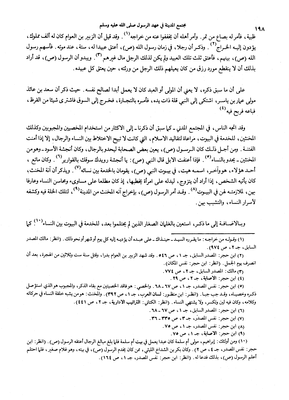 (1) وقوله من خراجه: ما يقرره السيد - حينذاك - على عبده أن يؤديه إليه كل يوم أو شهر أو نحو ذلك. (انظر: مالك المصدر السابق، جـ2، ص974). (2) ابن حجر: المصدر السابق، جـ1، ص546. وقد شهد الزبير بن العوام بدراً، وقتل سنة ست وثلاثين من الهجرة، بعد أن انصرف يوم الجمل. (انظر: ابن حجر: نفس المكان). (3) مالك: المصدر السابق، جـ2، ص774. (4) ابن حجر: الإصابة، جـ2، ص29. (5) ابن حجر: نفس المصدر، جـ1، ص67 - 68. والخصي: هو فاقد الخصيتين مع بقاء الذكر، والمجبوب هو الذي استؤصل ذكره وخصياه، وقد جب جبا. (انظر: ابن منظور: لسان العرب، جـ1، ص392). والمخنث: هو من يشبه خلقة النساء في حركاته وكلامه، وكان فيه لين وتكسر، ولا يشتهي النساء. (انظر: الكتاني: التراتيب الإدارية، جـ2، ص441). (6) ابن حجر: المصدر السابق، جـ1، ص67 - 68. (7) ابن حجر: نفس المصدر، جـ3، ص335 - 36. (8) ابن حجر: نفس المصدر، جـ1، ص75. (9) ابن حجر: الإصابة، جـ1، ص75. (10) ومن أولئك: إبراهيم، مولى أم سلمة كان عبداً يعمل في بيت أم سلمة فلما بلغ مبالغ الرجال أعتقه الرسول (ص). (انظر: ابن حجر: نفس المصدر، جـ4، ص2). وكان بكر بن الشداخ الليثي، ممن كان يخدم الرسول صلى الله عليه وسلم، في بيته، وهو غلام صغير، فلما احتلم أعلم الرسول صلى الله عليه وسلم، بذلك فدعا له. (انظر: ابن حجر: نفس المصدر، جـ1، ص164).