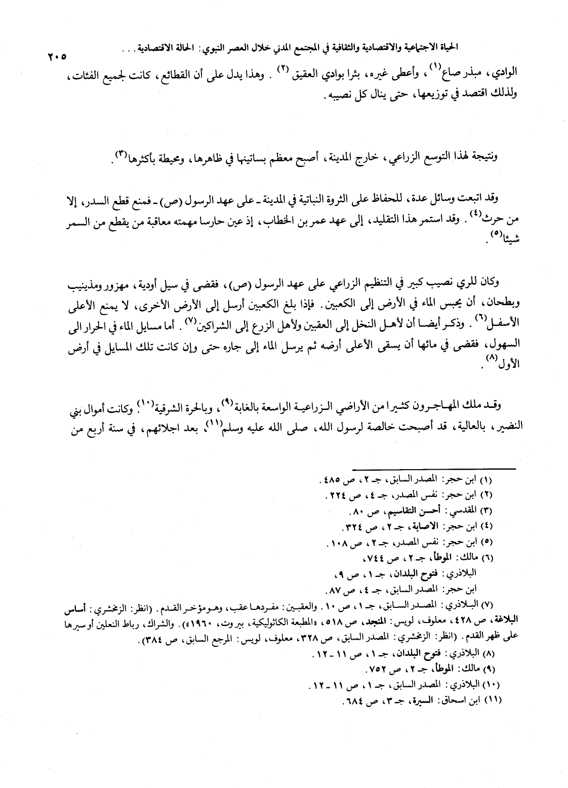 205…الوادي، مبذر صاع (1)، وأعطى غيره، بئراً بوادي العقيق (2). وهذا يدل على أن القطائع، كانت لجميع الفئات، ولذلك اقتصد في توزيعها، حتى ينال كل نصيبه. ونتيجة لهذا التوسع الزراعي، خارج المدينة، أصبح معظم بساتينها في ظاهرها، ومحيطة بأكثرها (3). وقد اتبعت وسائل عدة، للحفاظ على الثروة النباتية في المدينة - على عهد الرسول صلى الله عليه وسلم - فمنع قطع السدر، إلا من حرث (44). وقد استمر هذا التقليد، إلى عهد عمر بن الخطاب، إذ عين حارساً مهمته معاقبة من يقطع من السمر شيئاً (5). وكان للري نصيب كبير في التنظيم الزراعي على عهد الرسول صلى الله عليه وسلم، فقضى في سيل أودية، مهزور ومذينيب وبطحان، أن يحبس الماء في الأرض إلى الكعبين. فإذا بلغ الكعبين أرسل إلى الأرض الأخرى، لا يمنع الأعلى الأسفل (6). وذكر أيضاً أن لأهل النخل إلى العقبين ولأهل الزرع إلىالشراكين (7). أما مسايل الماء في الحرار إلى السهول، فقضى في مائها أن يسقى الأعلى أرضه ثم يرسل الماء إلى جاره حتى وإن كانت تلك المسايل في أرض الأول (8). وقد ملك المهاجرون كثيراً من الأراضي الزراعية الواسعة بالغابة (9)، وبالحرة الشرقية (10). وكانت أموال بني النضير، بالعالية، قد أصبحت خالصة لرسول الله، صلىالله عليه وسلم (11)، بعد إجلائهم، في سنة أربع من…