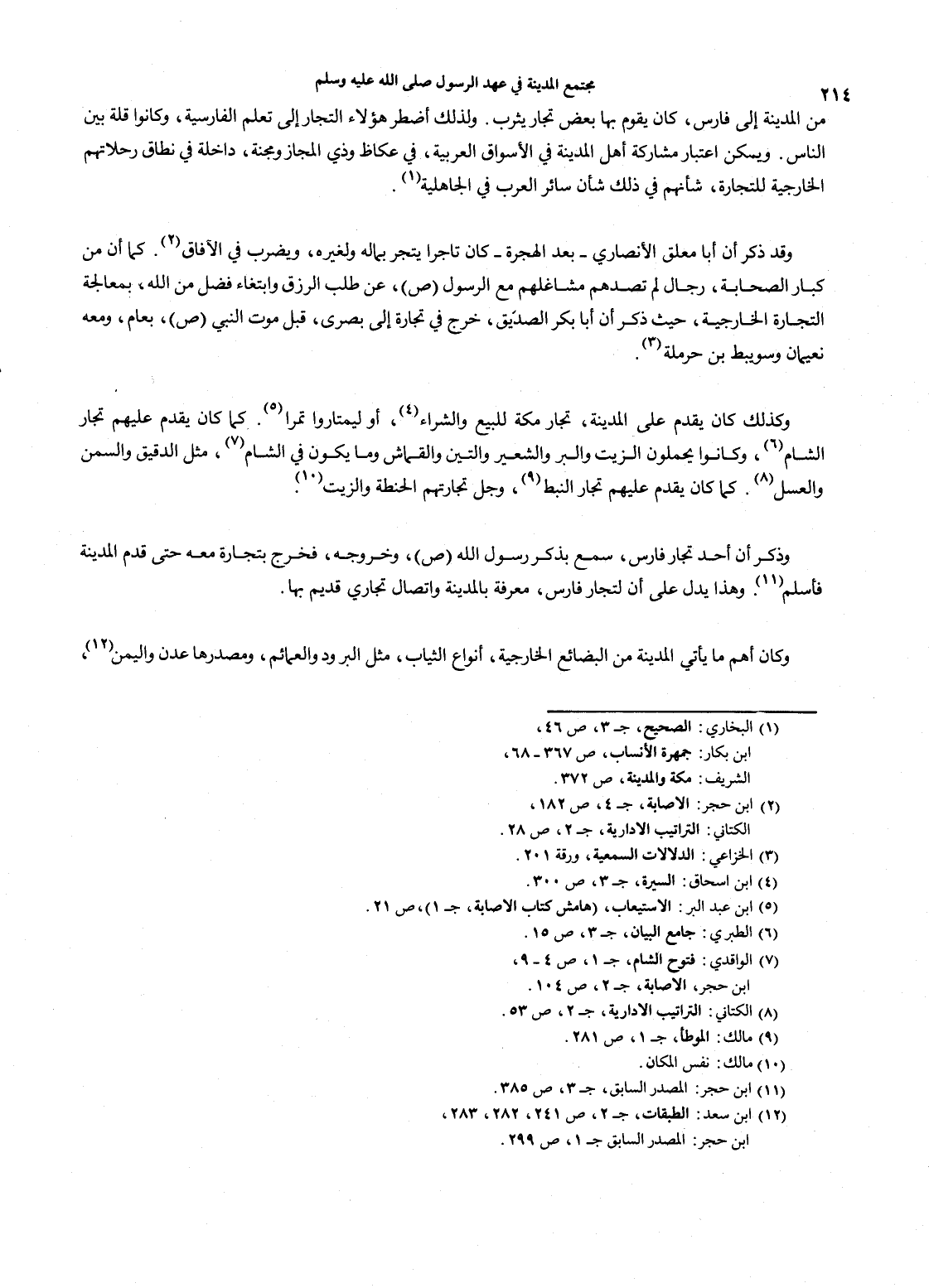 214…من المدينة إلى فارس، كان يقوم بها بعض تجار يثرب. ولذلك اضطر هؤلاء التجار إلى تعلم الفارسية، وكانوا قلة بين الناس. ويمكن اعتبار مشاركة أهل المدينة في الأسواق العربية، في عكاظ وذي المجاز ومجنة، داخلة في نطاق رحلاتهم الخارجية للتجارة، شأنهم في ذلك شأن سائر العرب في الجاهلية (1). وقد ذكر أن أبا معلق الأنصاري - بعد الهجرة - كان تاجراً يتجر بماله ولغيره، ويضرب في الآفاق (2). كما أن من كبار الصحابة، رجال لم تصدهم مشاغلهم مع الرسول صلى الله عليه وسلم، عن طلق الرزق وابتغاء فضل من الله، بمعالجة التجارة الخارجية، حيث ذكر أن أبا بكر الصديق، خرج في تجارة إلى بصرى، قبل موت النبي صلى الله عليه وسلم، بعام، ومعه نعيمان وسويبط بن حرملة (3). وكذلك كان يقدم على المدينة، تجار مكة للبيع والشراء (4)، أو ليمتاروا تمراً (15) كما كان يقدم عليهم تجار الشام (6)، وكانوا يحملون الزيت والبر والشعير والتين والقماش وما يكون في الشام (7)، مثل الدقيق والسمن والعسل (8). كما كان يقدم عليهم تجار النبط (9)، وجل تجارتهم الحنطة والزيت (10). وذكر أن أحد تجار فارس، سمع بكر رسول الله صلى الله عليه وسلم، وخروجه، فخرج بتجارة معه حتى قدم المدينة فأسلم (11). وهذا يدل على أن لتجار فارس، معرفة بالمدينة واتصال تجاري قديم بها. وكان أهم ما يأتي المدينة من البضائع الخارجية، أنواع الثياب، مثل البرود والعمائم، ومصدرها عدن واليمن (12)،…