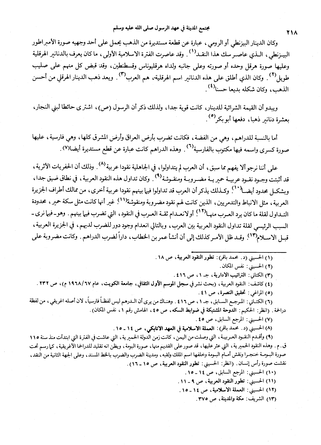(1) الحسيني (د. محمد باقر): تطور النقود العربية، ص18. (2) الحسيني: نفس المكان. (3) الكتاني: التراتيب الإدارية، جـ1، ص416. (4) كاشف: النقود العربية، (بحث نشر في سجل الموسم الأول الثقافي، جامعة الكويت، عام 67/ 1968م)، ص232. (5) المراغي: تحقيق النصرة، ص41. (6) الكتاني: المرجع السابق، جـ1، ص416. وهناك من يرى أن الدرهم ليس لفظاً فارسياً، لأن أصله إغريقي، من لفظة دراخمة. (انظر: الحكيم: الدوحة المشتبكة في ضوابط السكة، ص45، الهامش رقم 1، نفس المكان). (7) الحسيني: المرجع السابق، ص45. (8) الحسيني (د. محمد باقر): العملة الإسلامية في العهد الأتابكي، ص14 - 15. (9) وأقدم النقود العربية، التي وصلت من اليمن، كانت زمن الدولة الحميرية، التي عاشت في الفترة التي ابتدأت منذ سنة 115 ق. م. وهذه النقود الحميرية، التي عثر عليها، قد صور على القديم منها، صورة البومة، ويظن أنه تقليد للدراخما الإغريقية، كما رسم تحت صورة البومة خنجراً ونقش أمام البومة وخلفها اسم الملك ولقبه، ومدينة الضرب والضرب بالخط المسند، وعلى الجهة الثانية من النقد، نقشت صورة رأس إنسان. (انظر: الحسيني: تطور النقود العربية، ص15 - 16). (10) الحسيني: المرجع السابق، ص14 - 15. (11) الحسيني: تطور النقود العربية، ص9 - 11. (12) الحسيني: العملة الإسلامية، ص14 - 15. (13) الشريف: مكة والمدينة، ص375.