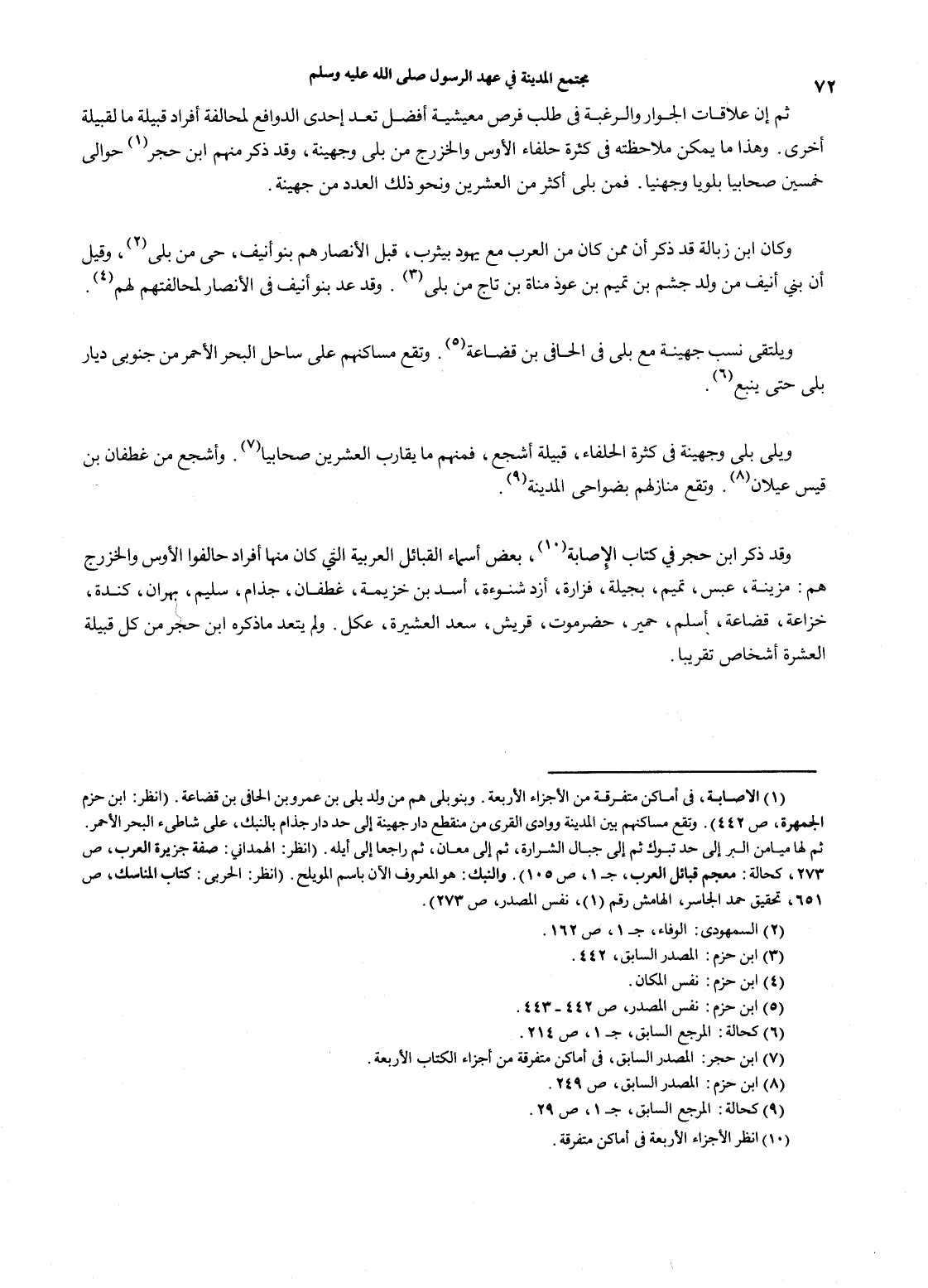 (1) الإصابة، في اماكن متفرقة من الأجزاء الأربعة. وبنو بلى هم من ولد بلى بن عمرو بن الحافي بن قضاعة. (انظر: ابن حزم الجمهرة، ص442). وتقع مساكنهم بين المدينة ووادي القرى من منقطع دار جهينة إلى حد دار جذام بالنبك، على شاطئ البحر الأحمر. ثم لها ميامن البر إلى حد تبوك ثم إلى جبال الشرارة، ثم إلى معان، ثم راجعاً إلى أيلة. (انظر: الهمداني: صفة جزيرة العرب، ص273، كحالة: معجم قبائل العرب، جـ1، ص105). والنبك: هو المعروف الآن باسم المويلج. (انظر: الحربي: كتاب المناسك، ص651، تحقيق حمد الجاسر، الهامش رقم (1)، نفس المصدر، ص273). (2) السمهودي: الوفاء، جـ1، ص162. (3) ابن حزم: المصدر السابق، ص442. (4) ابن حزم: نفس المكان. (5) ابن حزم: نفس المصدر، ص442 - 443. (6) كحالة: المرجع السابق، جـ1، ص214. (7) ابن حجر: المصدر السابق، في أماكن متفرقة من أجزاء الكتاب الأربعة. (8) ابن حزم: المصدر السابق، ص249. (9) كحالة: المرجع السابق، جـ1، ص29. (10) انظر الأجزاء الأربعة في أماكن متفرقة.