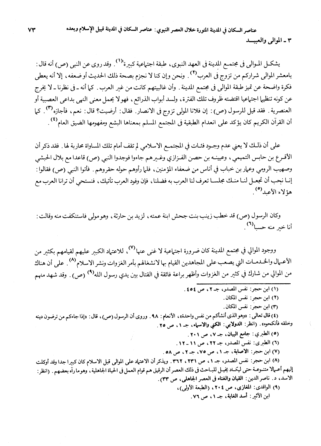 (1) ابن حجر: نفس المصدر، جـ2، ص454. (2) ابن حجر: نفس المكان. (3) ابن حجر: نفس المكان. (4) قال تعالى: "وهو الذي أنشأكم من نفس واحدة"، الأنعام: 98. وروى أن السرول صلى الله عليه وسلم، قال: "إذا جاءكم من ترضون دينه وخلقه فأنكحوه". (انظر: الدولابي: الكني والأسماء، جـ1، ص25. (5) الطبري: جامع البيان، جـ7، ص201. (6) الطبري: نفس المصدر، جـ22، ص11 - 12. (7) ابن حجر: الألإصابة، جـ1، ص75، جـ2، ص58. (8) ابن حجر: نفس المصدر، جـ1، ص231 - 362. ويذكر أن الاعتماد على الموالي قبل الإسلام كان كبيراً جداً وقد أولكت إليهم أعمالاً متنوعة حتى ليكاد يخيل للباحث في ذلك العصر أن الرقيق هم قوام العمل في الحياة الجاهلية، وهو ما رآه بعضهم. (انظر: الأسد، د. ناصر الدين: القيان والغناء في العصر الجاهلي، ص33). (9) الواقدي: المغازي، ص204، (الطبعة الأولى)، ابن الأثير: أسد الغابة، جـ1، ص76.