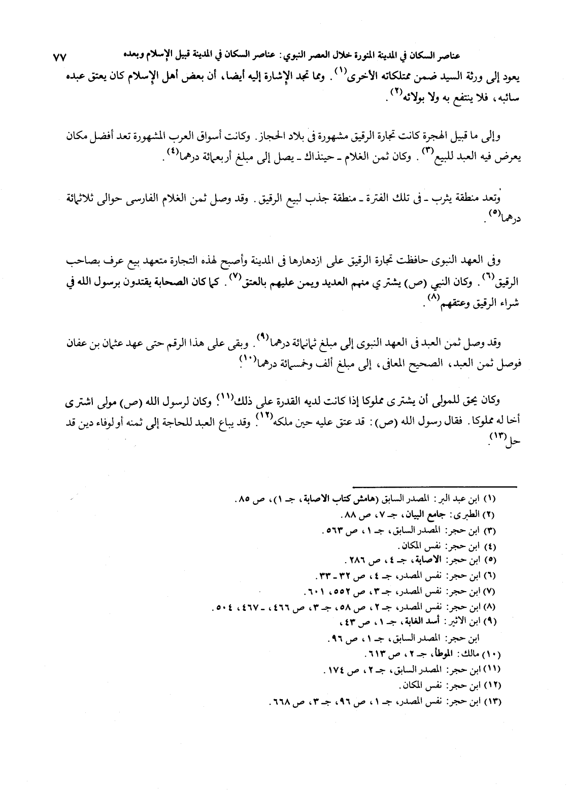 77…يعود إلى ورثة السيد ضمن مملتكاته الأخرى (1). ومما تجد الإشارة إليه أيضاً، أن بعض أهل الإسلام كان يعتق عبده سائبه، فلا ينتفع به ولا بولائه (2). وإلى ما قبيل الهجرة كانت تجارة الرقيق مشهورة في بلاد الحجاز. وكانت أسواق العرب المشهورة تعد أفضل مكان يعرض فيه العبد للبيع (3). وكان ثمن الغلام - حينذاك - يصل إلى مبلغ أربعمائة درهماً (4). وتعد منطقة يثرب - في تلك الفترة - منطقة جذب لبيع الرقيق. وقد وصل ثمن الغلام الفارسي حوالي ثلاثمائة درهماً (5). وفي العهد النبوي حافظت تجارة الرقيق على ازدهارها في المدينة وأصبح لهذه التجارة متعهد بيع عرف بصاحب الرقيق (6). وكان النبي صلى الله عليه وسلم يشتري منهم العديد ويمن عليهم بالعتق (7). كما كان الصحابة يقتدون برسول الله في شراء الرقيق وعتقهم (8). وقد وصل ثمن العبد في العهد النبوي إلى مبلغ ثمانمائة درهماً (9). وبقي على هذا الرقم حتى عهد عثمان بن عفان فوصل ثمن العبد، الصحيح المعافى، إلى مبلغ ألف وخمسمائة درهمً (10). وكان يحق للمولى أن يشتري مملوكاً إذا كانت لديه القدرة على ذلك (11). وكان لرسول الله صلى الله عليه وسلم مولى اشترى أخا له مملوكاً. فقال رسول الله صلى الله عليه وسلم : قد عتق عليه حين ملكه (12). وقد يباع العبد للحاجة إلى ثمنه أو لوفاء دين قد حل (13).…