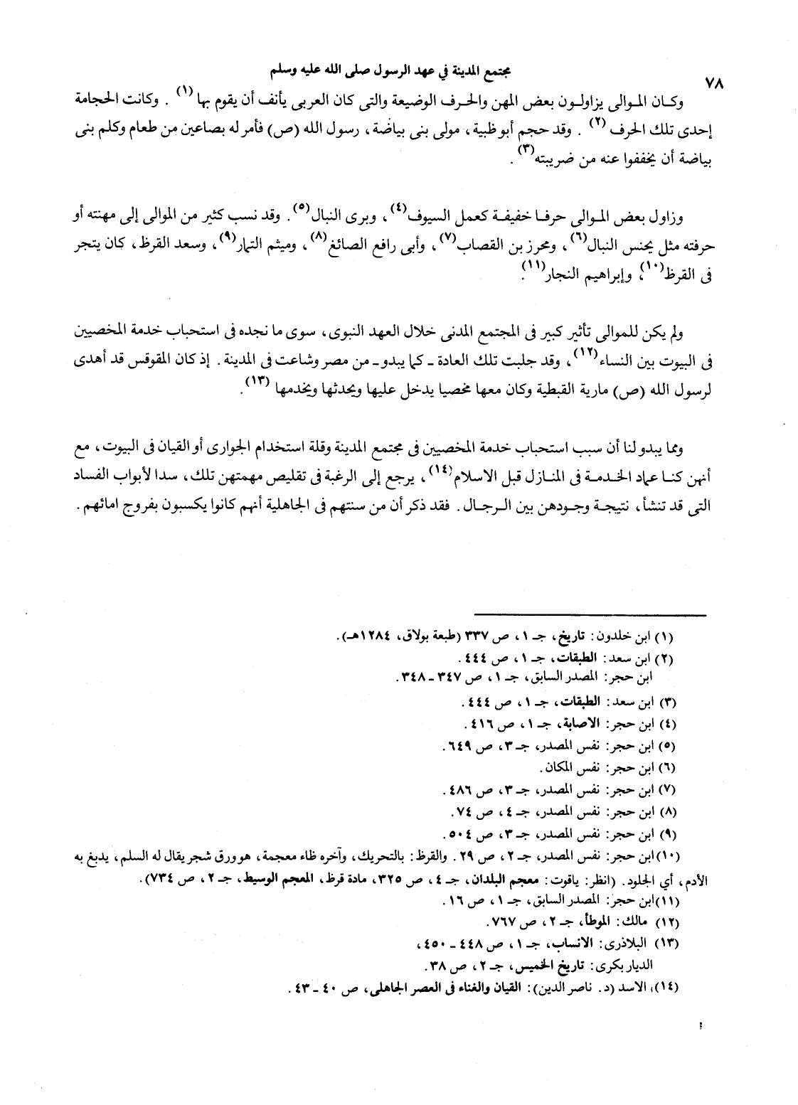 78…وكان الموالي يزاولون بعض المهن والحرف الوضيعة والتي كان العربي يأنف أن يقوم بها (1). وكانت الحجامة إحدى تلك الحرف (2). وقد حجم أبو ظبية، مولى بني بياضة، رسول الله صلى الله عليه وسلم فأمر له بصاعين من طعام وكلم بني بياضة أن يخففوا عنه من ضريبته (3). وزاول بعض الموالي حرفاً خفيفاً كعمل السيوف (4)، وبري النال (5). وقد نسب كثير من الموالي إلى مهنته أو حفته مثل يحنس النبال (6)، ومحرز بن القصاب (7)، وأبى رافع الصائغ (8)، وميثم التمار (9)، وسعد القرظ، كان يتجر في القرظ (10)، وإبراهيم النجار (11). ولم يكن للموالي تاثير كبير في المجتمع المدني خلال العهد النبوي، سوى ما نجده في استحباب خدمة المخصيين في البيوت بين النساء (12)، وقد جلبت تلك العادة - كما يبدو - من مصر وشاعت في المدينة. إذ كان المقوقس قد أهدى لرسول الله صلى الله عليه وسلم مارية القبطية وكان معها مخصياً يدخل عليها ويحدثها ويخدمها (13). ومما يبدو لنا أن سبب استحباب خدمة المخصيين في مجتمع المدينة وقلة استخدام الجواري أو القيان في البيوت، مع أنهن كن عماد الخدمة في المنازل قبل الإسلام (14)، يرجع إلى الرغبة في تقليص مهمتهن تلك، سداً لأبواب الفساد التي قد تنشأن نتيجة وجودهن بين الرجال. فقد ذكر أن من سنتهم في الجاهلية أنهم كانوا يكسبون بفروج إمائهم.…