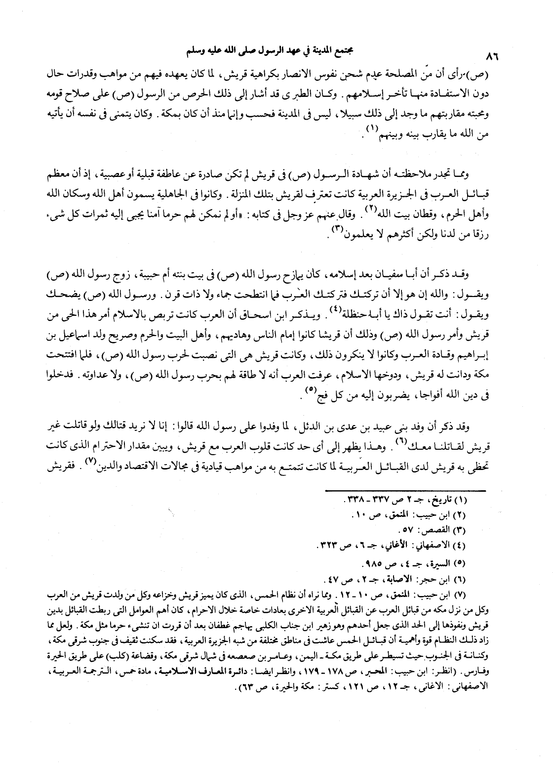 86… صلى الله عليه وسلم رأى أن من المصلحة عدم شحن نفوس الأنصار بكراهية قريش، لما كان بعهده فيهم من مواهب وقدرات حال دون الاستفادة منها تأخر إسلامهم. وكان الطبري قد أشار إلى ذلك الحرص من الرسول صلى الله عليه وسلم على صلاح قومه ومحبته مقاربتهم ما وجد إلى ذلك سبيلاً، ليس في المدينة فحسب وإنما منذ أن كان بمكة. وكان يتمنى في نفسه أن يأتيه من الله ما يقارب بينه وبينهم (1). ومما تجدر ملاحظته أن شهادة الرسول صلى الله عليه وسلم في قريش لم تكن صادرة عن عاطفة قبلية أو عصبية، إذ أن معظم قبائل العرب في الجزيرة العربية كانت تعترف لقرش بتلك المنزلة. وكانوا في الجاهلية يسمون أهل الله وسكان الله وأهل الحرم، وقطان بيت الله (2). وقال عنهم عز وجل في كتابه: "أو لم نمكن لهم حرماً آمناً يجبيى إليه ثمرات كل شيء رزقاً من لدنا ولكن أكثرهم لا يعلمون" (3). وقد ذكر أن أبا سفيان بعد إسلامه، كان يمازح رسول الله صلى الله عليه وسلم في بيت ابنته أم حبيبة، زوج رسول الله صلى الله عليه وسلم ويقول: والله إن هو إلا أن تركتك فتركتك العرب فما انتطحت جماء ولا ذات قرن. ورسول الله صلى الله عليه وسلم يضحك ويقول: أنت تقول ذاك يا أبا حنظلة (4). ويذكر ابن إسحاق أن العرب كانت تربص بالإسلام أمر هذا الحي من قريش وأمر رسول الله صلى الله عليه وسلم وذلك أن قريشاً كانوا إمام الناس وهاديهم، وأهل البيت والحرم وصريح ولد إسماعيل بن إبراهيم وقادة العرب وكانوا لا ينكرون ذلك، وكانت قريش هي التي نصبت لحرب رسول الله صلى الله عليه وسلم، فلما افتتحت مكة ودانت له قريش، ودوخها الإسلام، عرفة العرب أنه لا طاقة لهم بحرب رسول الله صلى الله عليه وسلم، ولا عداوته. فدخلوا في دين الله أفواجاً، يضربون إليه من كل فج (5). وقد ذكر أن وفد بني عبيد بن عدي بن الدئل، لما وفدوا على رسول الله قالوا: إنا لا نريد قتالك ولو قاتلت غير قريش لقاتلنا معك (6). هذا يظهر إلى أي حد كانت قلوب العرب مع قريش، ويبين مقدار الاحترام الذي كانت تحظى به قريش لدى القبائل العربية لما كانت تتمتع به من مواهب قيادية في مجالات الاقتصاد والدين (7). فقريش…