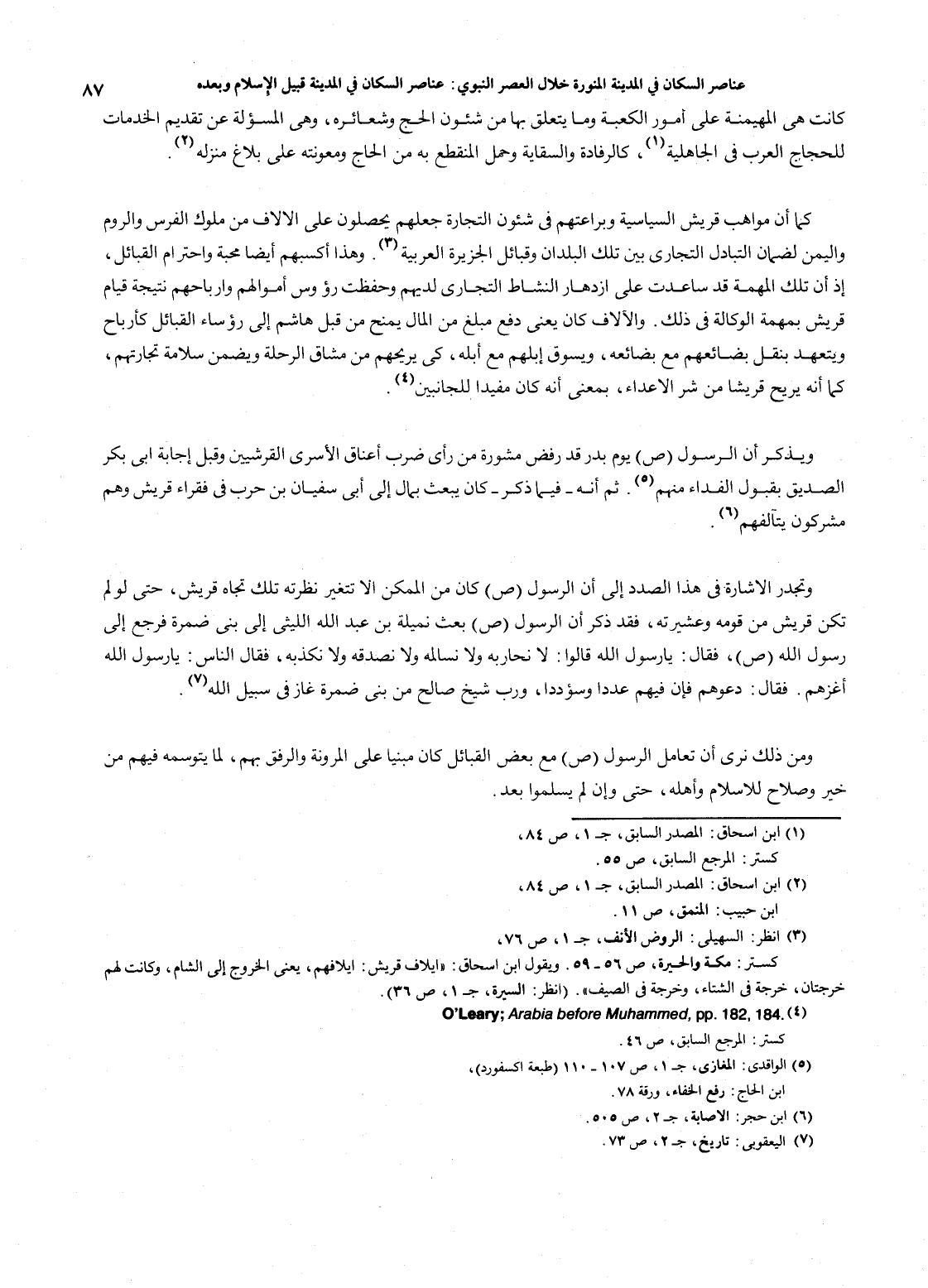 87…كانت هي المهيمنة على أمور الكعبة وما يتعلق بها من شئون الحج وشعائه، وهي المسؤولة عن تقديم الخدمات للحجاج العرب في الجاهلية (1)، كالرفادة والسقاية وحمل المنقطع به من الحاج ومعونه على بلاغ منزله (3). كما أن مواهب قريش السياسية وبراعتهم في شئون التجارة جعلهم يحصلون الآلاف من ملوك الفرس والروم واليمن لضمان التبادل التجاري بين تلك البلدان وقبائل الجزيرة العربية (3). وهذا أكسبهم أيضاً محبة واحترام القبائل، إذ أن تلك المهمة قد ساعدت على ازدهار النشاط التجاري لديه وحفظت رؤوس أموالهم وأرباحهم نتيجة قيام قريش بمهمة الوكالة في ذلك. والآلاف كان يعني دفع مبلغ من المال يمنح من قبل هاشم إلى رؤساء القبائل كأرباح ويتعهد بنقل بضائهم مع بضائعه، ويسوق إبلهم مع أبله، كي يريحهم من شاق الرحلة ويضمن سلامة تجارتهم، كما أنه يريح قريشاً من شر الأعداء، بمعنى أنه كان مفيداً للجانبين (4). ويذكر أن الرسول صلى الله عليه وسلم يوم بدر قد رفض مشورة من رأى ضرب أعناق الأسرى القرشيين وقبل إجابة أبي بكر الصديق بقبول الفداء منهم (5). ثم إنه - فيما ذكر - كان يبعث بمال إلى أبي سفيان بن حرب في فقراء قريش وهم مشركون يتآلفهم (6). وتجدر الإشارة في هذا الصدد إلى أن الرسول صلى الله عليه وسلم كان من الممكن ألا تتغير نظرته تلك تجاه قريش، حتى لو لم تكن قريش من قومه وعشيرته، فقد ذكر أن الرسول صلى الله عليه وسلم بعث نميلة بن عبدالله اللثي إلى بني ضمرة فرجع إلى رسول الله صلى الله عليه وسلم، فقالك يا رسول الله قالوا: لا نحاربه ولا نسالمه ولا نصدقه ولا نذكبه، فقال الناس: يا رسول الله أغزهم. فقال: دعوهم فإن فيهم عدداً وسؤدداً، ورب شيخ صالح من بني ضمرة غاز في سبيل الله (7). ومن ذلك نرى أن تعامل الرسول صلى الله عليه وسلم مع بعض القبائل كان مبنياً على المرونة والرفق بهم، لما يتوسمه فيهم من خير وصلاح للإسلام وأهله، حتى وإن لم يسلموا بعد.…
