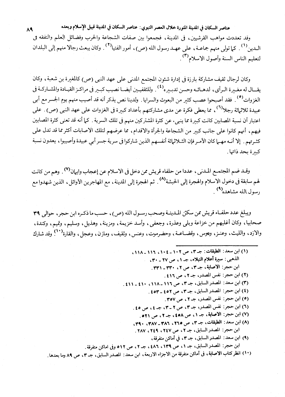 89…وقد تعددت مواهب القرشيين، في المدينة، فجمعوا بين صفات الشجاعة والحرب وفضائل العلم والنفقة في الدين (1). كما تولى منهم جماعة، على عهد رسول الله صلى الله عليه وسلم، أمور الفتيا (2). وكان يبعث رجالاً منهم إلى البلدان لتعليم الناس السنة وأصول الإسلام (3). وكان لرجال ثقيف مشاركة بارزة في إدارة شئون المجتمع المدني على عهد النبي صلى الله عليه وسلم كالمغيرة بن شعبة، وكان يقال له مغيرة الرأي، لدهائه وحسن تدبيره (4). وللثقفيين أيضاً نصيب كبير في مراكز القيادة والمشاركة في الغزوات (5). فقد أصبحوا عصب كثير من البعوث والسرايا. ولدينا نص يذكر أنه قد أصيب منهم يوم الجسر مع أبي عبيدة ثلاثمائة رجلاً (6)، مما يعطي فكرة عن مدى مشاركتهم بأعداد كبيرة في الغزوات على عهد النبي (ص). على اعتبار أن نسبة المصابين كانت كبيرة مما ينبئ عن كثرة المشتركين منهم في تلك السرية. كما أنه قد تعني كثيرة المصابين فيهم، أنهم كانوا على جانب كبير من الشجاعة والجرأة والإقدام، مما عرضهم لتلك الأصابات أكثر مما قد تدل على كثرتهم. إلا أنه مهما كان الأمر فإن الثلاثمائة أنفسهم الذين شاركوا في سرية جسر أبي عبيدة وأصيبوا، يعدون نسبة كبيرة بحد ذاتها. وقد ضم المجتمع المدني، عدداً من حلفاء قريش ممن دخل في الإسلام عن إعجاب وإيمان (7). وهم من كانت لهم سابقة في دخول الإسلام والهجرة إلى الحبشة (8). ثم الهجرة إلىالمدينة، مع المهاجرين الأوائل، الذين شهدوا مع رسول الله مشاهده (9). ويبلغ عدد حلفاء قريش ممن سكن المدينة وصحب رسول الله صلى الله عليه وسلم، حسب ما ذكره ابن حجر، حوالي 39 صحابياً، وكان أغلبهم من خزاعة وبلى وعذرة، وجعفى، وأسد خزيمة، ومزينة، وهذيل، وسليم، وتميم، وكندة، والأزد، والليث، وعنز، ودوس، وقضاعة، وحرموت، وعنس، وثقيف، ومازن، وعجل، والقارة (10). وقد شارك…