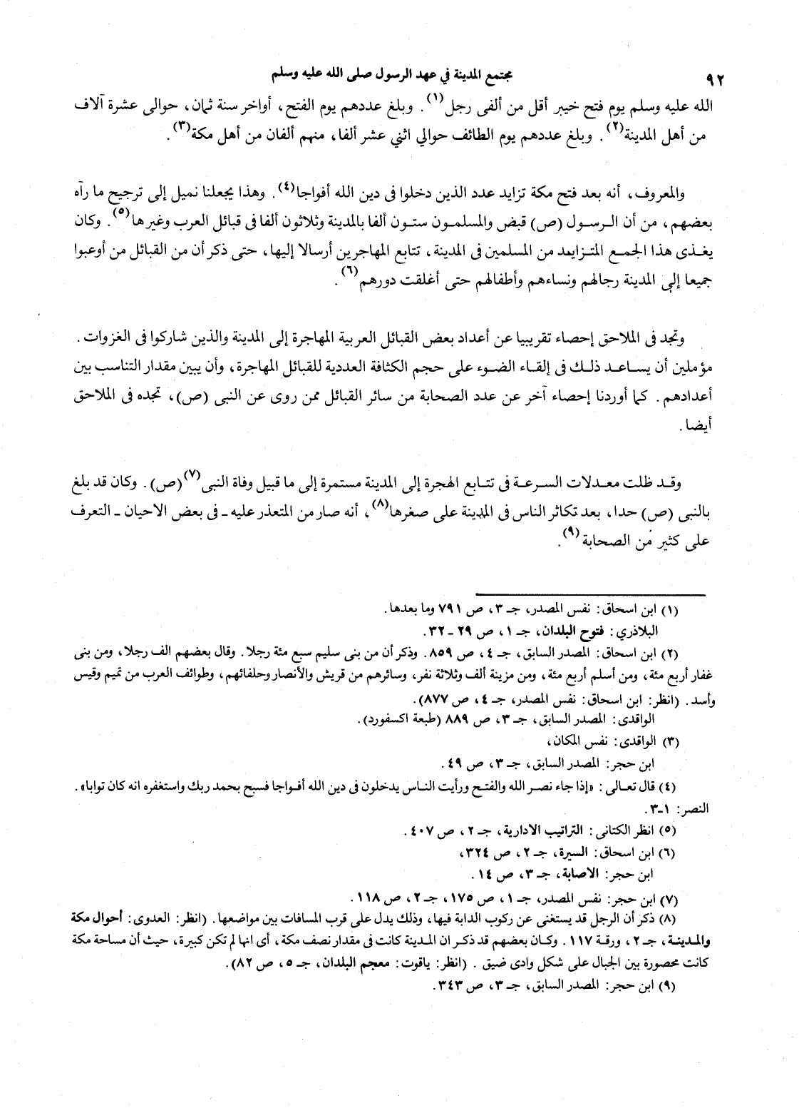 (1) ابن إسحاق: نفس المصدر، جـ3، ص791 وما بعدها. البلاذري: فتوح البلدان، جـ1، ص29 - 32. (2) ابن إسحاق: المصدر السابق، جـ4، ص859. وذكر أن من بني سليم سبع مئة رجلاً. وقال بعضهم ألف رجلاً، ومن بني غفار أربع مئة، ومن أسلم أربع مئة، ومن مزينة ألف وثلاثة نفر، وسائرهم من قريش والأنصار وحلفائهم، وطوائف العرب من تميم وقيس وأسد. (انظر: ابن إسحاق: نفس المصدر، جـ4، ص877). الواقدي: المصدر السابق، جـ3، ص889 (طبعة أكسفورد). (3) الواقدي: نفس المكان، ابن حجر: المصدر السابق، جـ3، ص49. (4) قال تعالى: "إذا جاء نصر الله والفتح ورأيت الناس يدخلون في دين الله أفواجاً فسبح بحمد ربك واستغفره إنه كان توابا". النصر: 1 - 3. (5) انظر الكتاني: التراتيب الإدارية، جـ2، ص407. (6) ابن إسحاق: السيرة، جـ2، ص324، ابن حجر: الإصابة، جـ3، ص14. (7) ابن حجر: نفس المصدر، جـ1، ص175، جـ2، ص118. (8) ذكر أن الرجل قد يستغني عن ركوب الدابة فيها، وذلك يدل على قرب المسافات بين مواضعها. (انظر: العدوى: أحوال مكة والمدينة، جـ2، ورقة 117. وكان بعضهم قد ذكر أن المدينة كانت في مقدار نصف مكة، أي أنها لم تكن كبيرة، حيث أن مساحة مكة كانت محصورة بين الجبال على شكل وادي ضيق. (انظر: ياقوت: معجم البلدان، جـ5، ص82). (9) ابن حجر: المصدر السابق، جـ3، ص343.