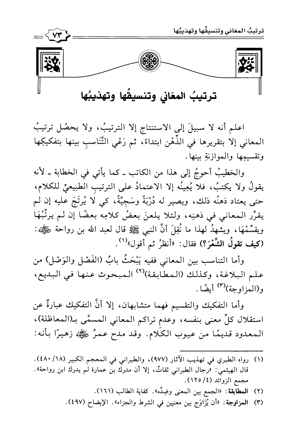 والخطيبُ أحوجُ إلى هذا من الكاتب -كما يأتي في الخطابة- لأنه يقولُ ولا يكتبُ، فلا يُعِينُه إلا الاعتمادُ على الترتيبِ الطبيعيِّ للكلام، حتى يعتاد ذهنُه ذلك، ويصير له دُرْبَةً وسَجِيَّةً، كي لا يُرتَجَ عليه إن لم يقرِّر المعاني في ذهنِه، ولئلا يلعنَ بعضُ كلامِه بعضًا إن لم يرتِّبْهَا ويقسِّمْهَا، ويشهدُ لهذا ما نُقِلَ أنَّ النبي - صلى الله عليه وسلم - قال لعبد الله بن رواحة - رضي الله عنه -: "كيف تقولُ الشِّعْرَ؟ فقال: أنظرُ ثم أقول".