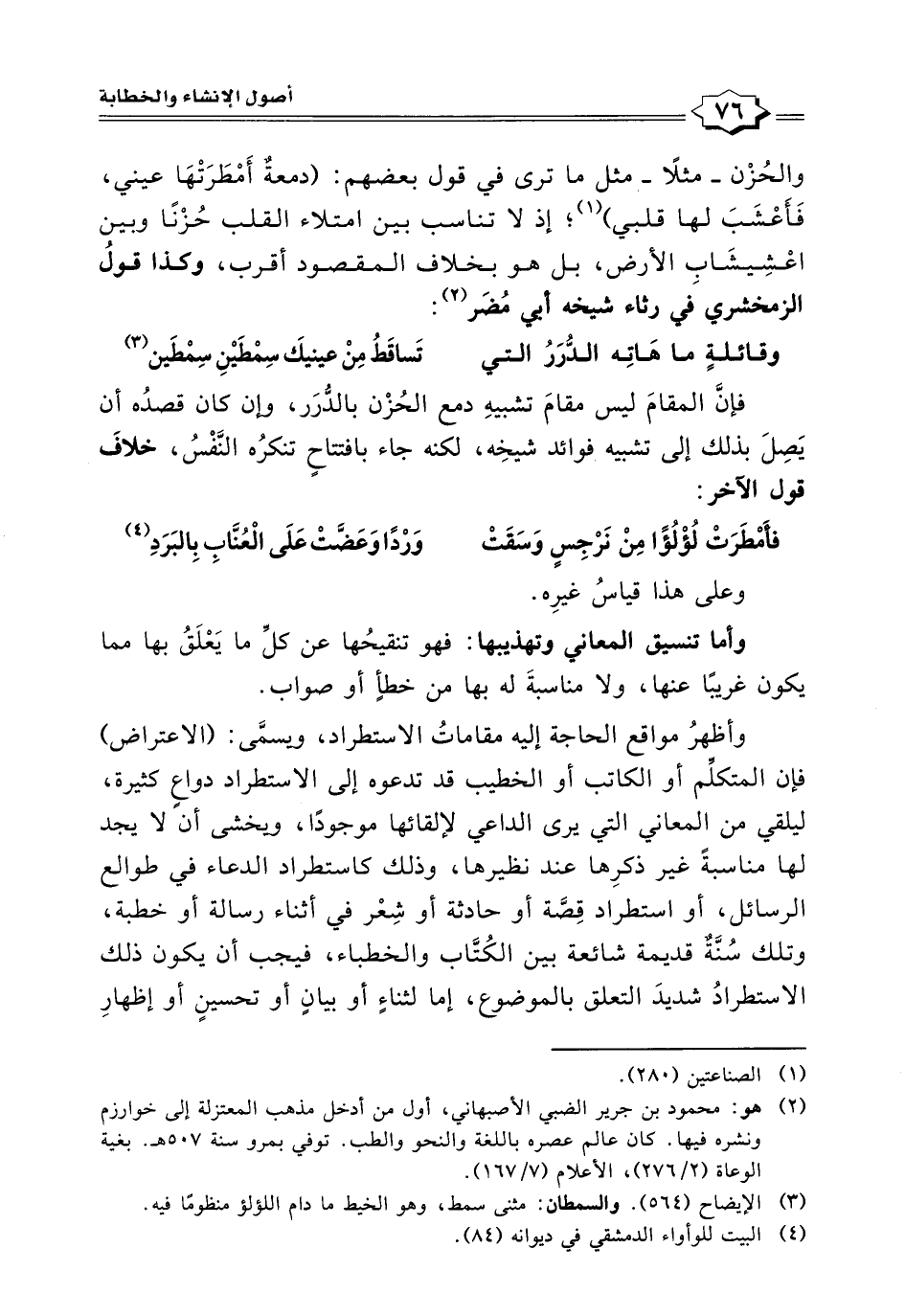 وأما تنسيق المعاني وتهذيبها: فهو تنقيحُها عن كلِّ ما يَعْلَقُ بها مما يكون غريبًا عنها، ولا مناسبةَ له بها من خطأٍ أو صواب. وأظهرُ مواقع الحاجة إليه مقاماتُ الاستطراد، ويسمَّى: (الاعتراض) فإن المتكلِّم أو الكاتب أو الخطيب قد تدعوه إلى الاستطراد دواعٍ كثيرة، ليلقي من المعاني التي يرى الداعي لإلقائها موجودًا، ويخشى أن لا يجد لها مناسبةً غير ذكرِها عند نظيرها، وذلك كاستطراد الدعاء في طوالع الرسائل، أو استطراد قِصَّة أو حادثة أو شِعْر في أثناء رسالة أو خطبة، وتلك سُنَّةٌ قديمة شائعة بين الكُتَّاب والخطباء، فيجب أن يكون ذلك الاستطرادُ شديدَ التعلق بالموضوع، إما لثناءٍ أو بيانٍ أو تحسينٍ أو إظهارِ