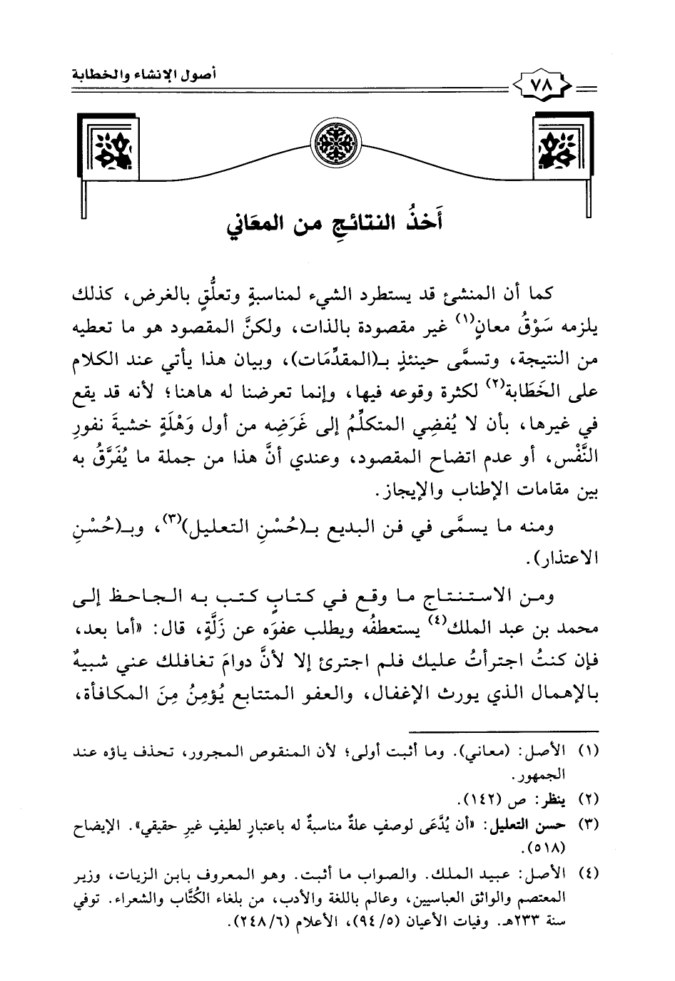 كما أن المنشئ قد يستطرد الشيء لمناسبةٍ وتعلُّقٍ بالغرض، كذلك يلزمه سَوْقُ معانٍ غير مقصودة بالذات، ولكنَّ المقصود هو ما تعطيه من النتيجة، وتسمَّى حينئذٍ بـ (المقدِّمَات)، وبيان هذا يأتي عند الكلام على الخَطَابة لكثرة وقوعه فيها، وإنما تعرضنا له هاهنا لأنه قد يقع في غيرها، بأن لا يُفضِي المتكلِّمُ إلى غَرَضِه من أول وَهْلَةٍ خشيةَ نفورِ النَّفْس، أو عدم اتضاح المقصود، وعندي أنَّ هذا من جملة ما يُفَرَّقُ به بين مقامات الإطناب والإيجاز، ومنه ما يسمَّى في فن البديع بـ (حُسْنِ التعليل)، وبـ (حُسْنِ الاعتذار)، ومن الاستنتاج ما وقع في كتابٍ كتب به الجاحظ إلى محمد بن عبد الملك يستعطفُه ويطلب عفوَه عن زَلَّةٍ، قال: "أما بعد، فإن كنتُ اجترأتُ عليك فلم أجترئ إلا لأنَّ دوامَ تغافلك عني شبيهٌ بالإهمال الذي يورث الإغفال، والعفو المتتابع يُؤمِنُ مِنَ المكافأة،