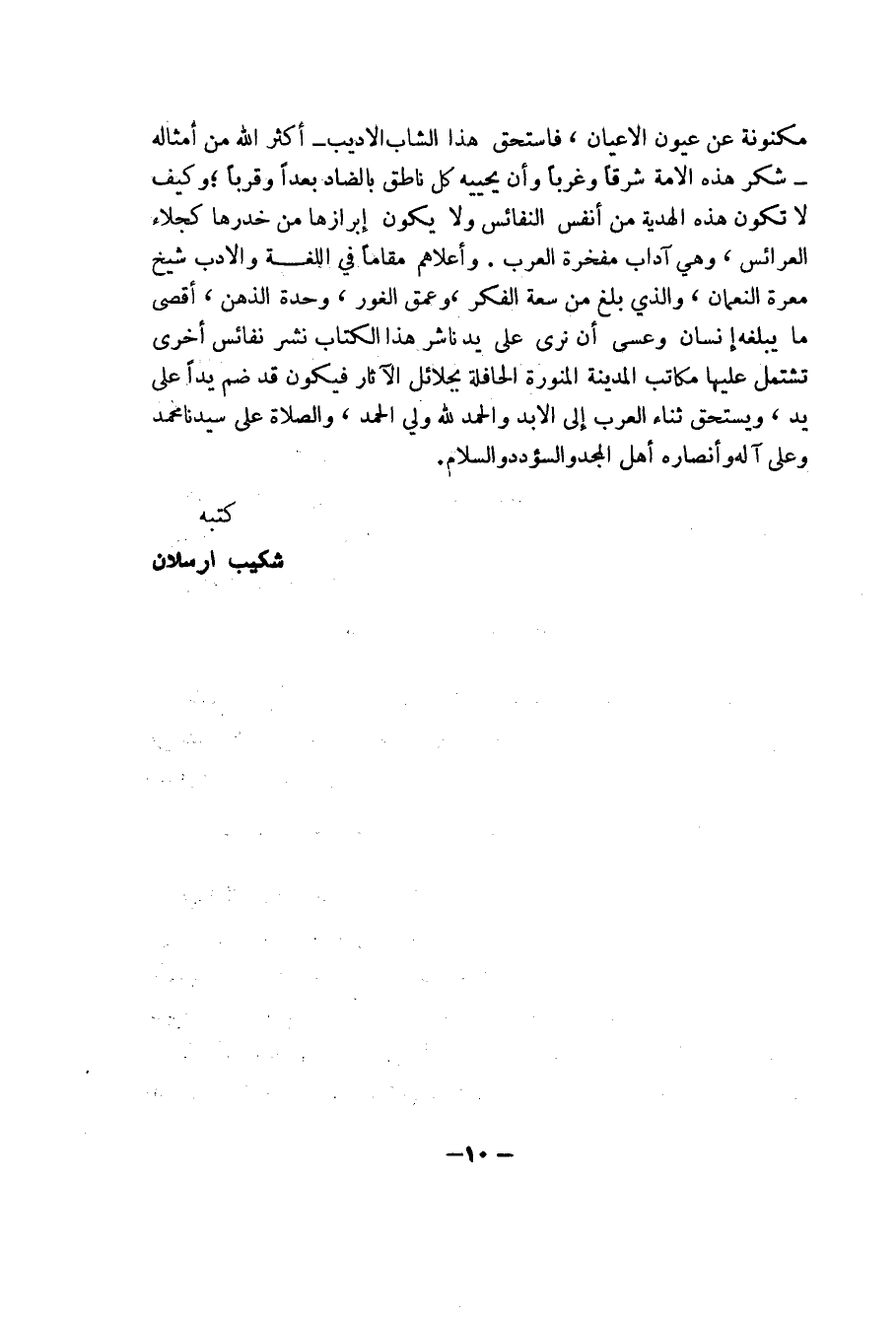 وأعلاهم مقاماً في اللغة والادب شيخ معرة النعمان، والذي بلغ من سعة الفكر، وعمق الغور، وحدة الذهن، أقصة ما يبلغه إنسان وعسى أن ناشر هذا الكتاب نشر نفائس أخرى تشتمل عليها مكاتب المدينة المنورة الحافلة بجلائل الآثار فيكون قد ضم يداً على يد، ويستحق ثناء العرب إلى الابد والحمد الله ولي الحمد، والصلاة على سيدنا محمد وعلى آله وأنصاره أهل المجد والسؤدد والسلام.