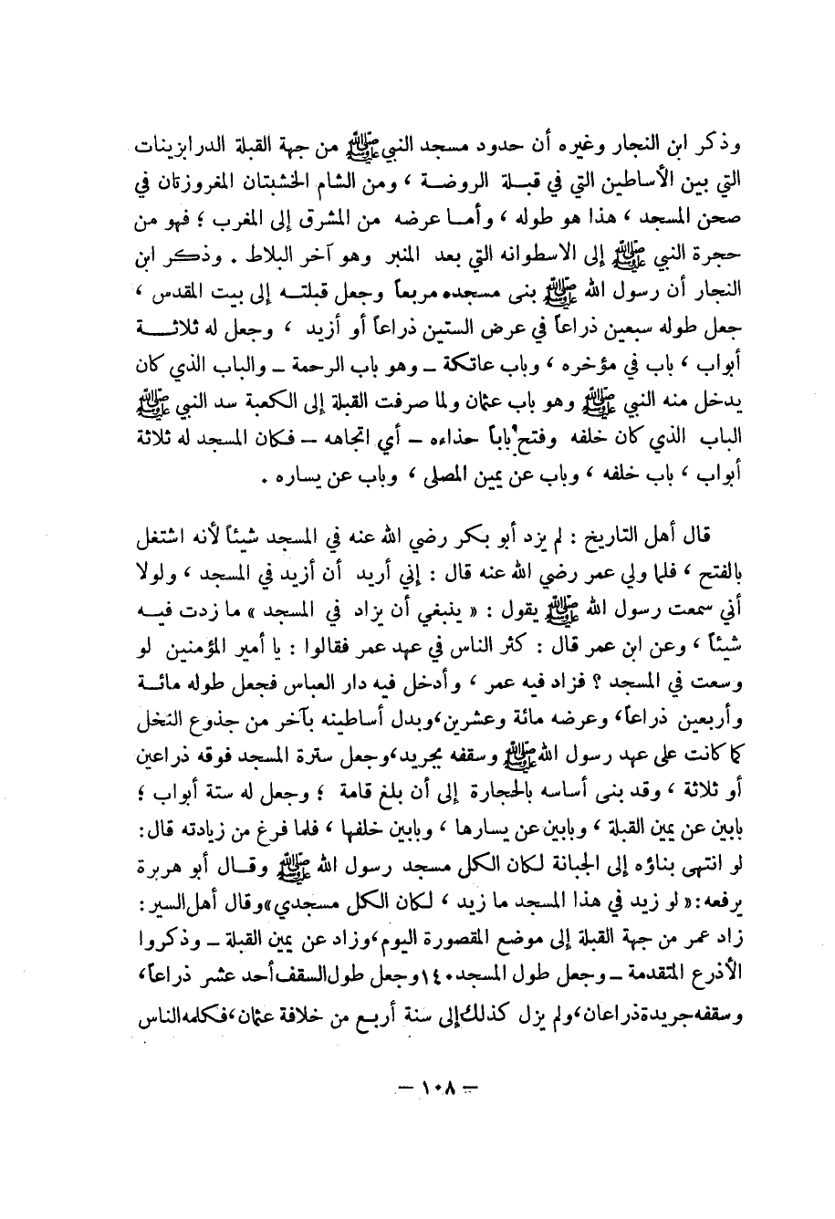 108 ... وذكر ابن النجار وغيره أن حدود مسجد النبي صلى الله عليه وسلم من جهة القبلة الدرابزينات التي بين الأساطين التي في قبلة الروضة، ومن الشام الشخبتان المغروزتان في صحن المسجد، هذا هو طوله، واما رعضه من المشرق إلى المغرب؛ فهو من حجرة النبي صلى الله عليه وسلم إلى الاسطوانة التي بعد المنبر وهو آخر البلاط.