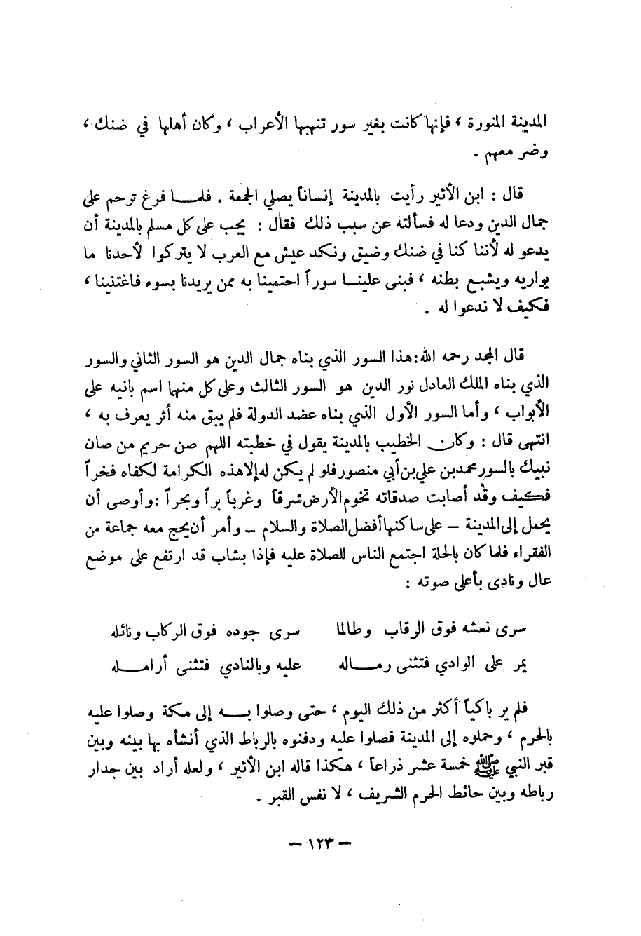 فلما فرغ ترحم على جمال الدين ودعا له فسألته عن سبب ذلك فقال: يجب على كل مسلم بالمدينة أن يدعو له لأننا كنا في ضنك وضيق ونكد عيش مع العرب لا يتركوا لأحدنا ما يواريه ويشبع بطنه، فنبى علينا سوراً احتمينا به ممن يريدنا بسوء فاغتنينا، فكيف لا ندعوا له.