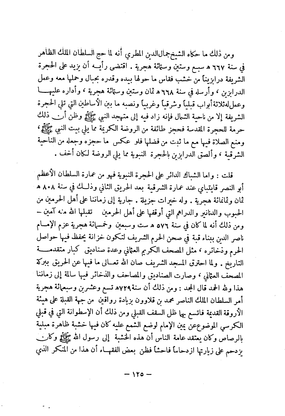 125 ... ومن ذلك ما حكاه الشيخ جمال الدين المطري أنه لما حج السلطان الملك الظاهر في سنة 667هـ سبع وستين وستمائة هجرية. اقتضى رأيه أن يزيد على الحجرة الشريفة درابزيناً ن خشب قفاس ما حولها بيده وقدره بجبال وحملها معه وعمل الدرابزين، وأرسله في سنة 668هـ ثمان وستين وستمائة هجرية، وأدار عليها وعمل له ثلاثة أبواب قبلياً وشرقياً وغربياً ونصبه ما بين الأساطين التي تلي الحجرة الشريفة إلا من ناحية الشمال فإنه زاد فيه إلى متهجد النبي صلى الله عليه وسلم وظن أن ذلك حرمة للحجرة المقدسة فحجز طائفة من الروضة الكريمة مما يلي بيت النبي صلى الله عليه وسلم، ومنع الصلاة فيها مع ما ثبت من فضلها فلو عكس ما حجزه وجعله من الناحسة الشرقية، وألصق الدرابزين بالحجرة النبوية مما يلي الروضة لكان أخف.