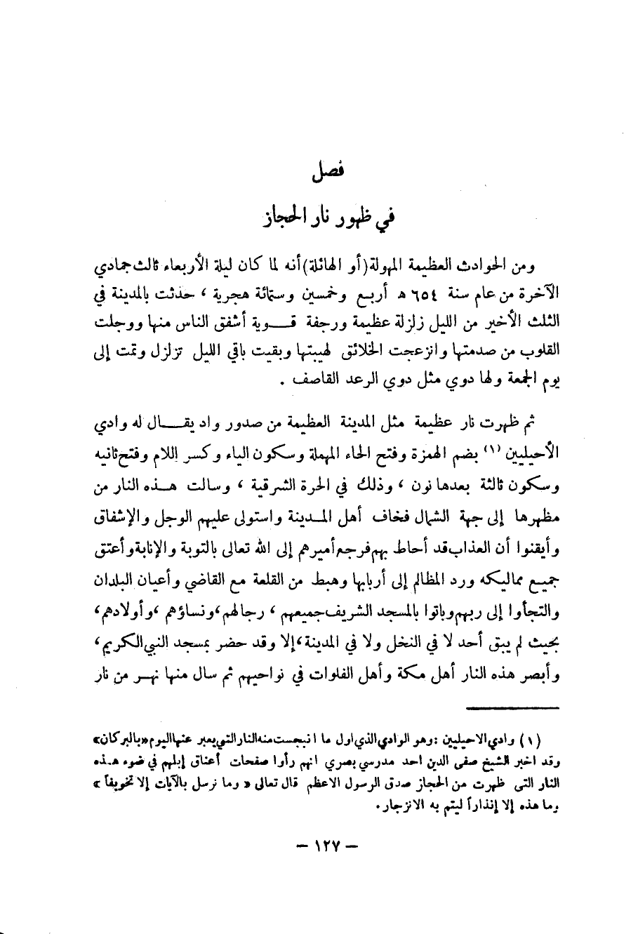 (1) وادي الاحيليين: وهو الوادي الذي اول ما انبجست منه النار التي يعبر عنها اليوم (بالبركان) وقد اخبر الشيخ صفى الدين أحد مدرسي بصري انهم رأوا صفحات أعناق إبلهم في ضوء هذه النار التي ظهرت من الحجاز صدق الرسول الأعظم قال تعالى (وما نرسل بالآيات إلا تخويفاً) وما هذه إلا إنذاراً ليتم به الانزجار.