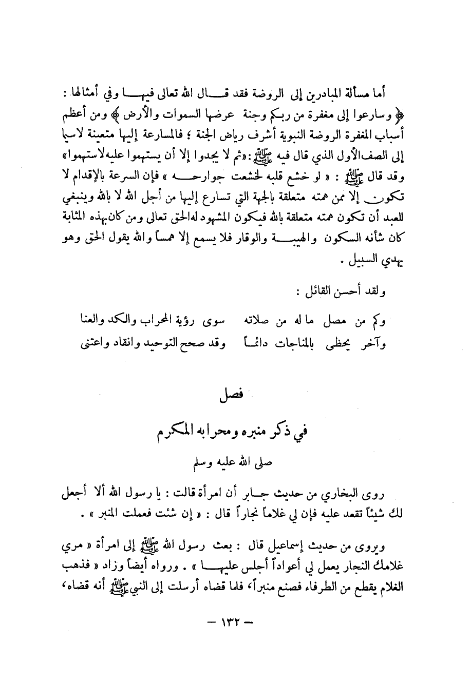 132 ... أما مسألة المبادرين إلى الروضة فقد قال الله تعالى فيها وفي أمثالها: (وسارعوا إلى مغفرة من ربكم وجنة عرضها السموات والأرض) ومن أعظم أسباب المغفرة الروضة النبوية أشرف رياض الجنة؛ فالمسارعة إليها متعينة لا سيما إلى الصف الأول الذي قال فيه صلى الله عليه وسلم: (ثم لا يجدوا إلا أن يستهموا عليه لستمهوا) وقد قال صلى الله عليه وسلم: (لو خشع قلبه لخشعت جوارحه) فإن السرعة بالإقدام لا تكون إلا ممن همته متعلقة بالجهة التي تسارع إليها من أجل الله لا بالله وينبغي للعبد أن تكون همته متعلقة بالله فيكون المشهود له الحق تعالى ومن كان بهذه المثابة كان شأنه السكون والهيبة والوقار فلا يسمع إلا همساً والله يقول الحق وهو يهدي السبيل.