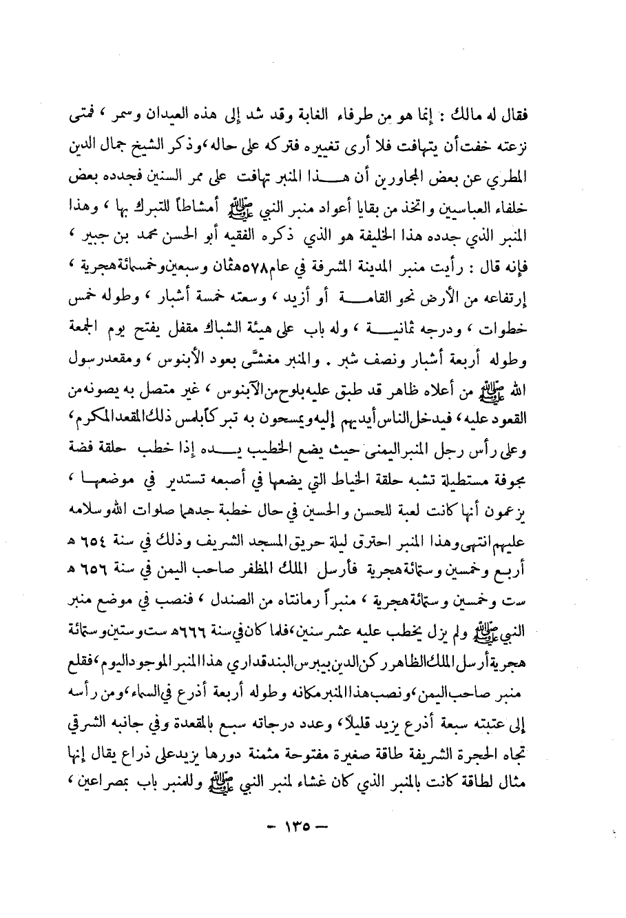 135 ... فقال له مالك: إنما هو من طرفاء الغابة وقد شد إلى هذه العيدان وسمر، فمتى نزعته خفت أن يتهافت فلا أرى تغييره فتركه على حاله، وذكر الشيخ جمال الدين المطري عن بعض المجاورين أن هذا المنبر تهافت على ممر السنين فجدده بعض خلفاء العباسيين واتخذ من بقايا أعواد منبر النبي صلى الله عليه وسلم أمشاطاً للتبرك بها، وهذا المنبر الذي جدده هذا الخليفة هو الذي ذكره الفقيه أبو الحسن محمد بن جبير، فإنه قال: رأيت منبر المدينة المشرفة في عام 578هـ ثمان وسبعين وخمسمائة هجرية، إرتفاعه من الأرض نحو القامة أو أزيد، وسعته خمسة أشبار، وطوله خمس خطوات، ودرجه ثمانية، وله باب على هيئة الشباك مقفل يفتح يوم الجمعة وطوله أربع أشبار ونصف شبر.